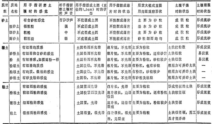 释义 | 鉴别土壤质地的感官法测定 本法是以我们手指的感觉为主,而结合视觉、听觉来确定土壤质地,这个方法非但方便,同时熟练以后也相当准确。 鉴别土壤质地时,先取小块土样(比算盘珠子略大),用手指捏碎,然后加入口水或水,藉手指的力量接触磨擦碎土和把它搓成直径约1.5cm的土团,所加的水分以能使土粒团聚为度。此外若含有细砾、新生体或浸入体等,须先检出以免影响感觉。当手指与碎土和土团不断接触磨擦中,我们就可以得出一些概念,其指标见表5-11。 表5-11 感官法鉴别土壤质地的指标 初次工作者可先用已知质地的土壤进行练习,根据各人的体会,即可得出要领来。干旱区域的土壤,感官法鉴别的结果常比室内分析结果偏轻,湿润区和含有机质较多的土壤则相反。 |