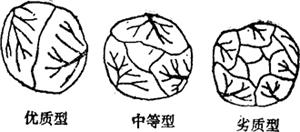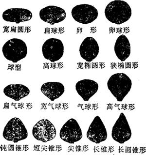 图28-1 甘蓝的叶球形状 (引白O.Ulvinen,et.al,Testing for Genuineness of Cultivar,1973) (2)叶球大小,颜色; (3)叶球坚实程度(可用拇指向叶球顶端往下压); (4)叶片覆盖性:分紧包型、中等型、松散型(如图28-2)。