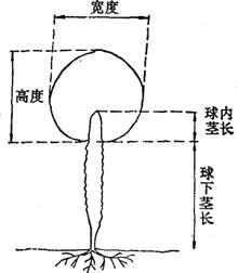 图28-3 甘蓝叶球和茎高测量方法 (来源同图28-1) 【参考文献】: 〔1〕浙江农业大学主编(1978),蔬菜栽培学各论,290-305,农业出版社。 〔2〕王坚等(1981),西瓜,科学出版社。 〔3〕合肥种子公司(1981),杂交西瓜,安徽科技出版社。 〔4〕清水茂监修(1977),野菜园艺大事典,797-812,(日)养贤堂发行。 〔5〕农山渔村文化协会(1983),野菜全书メロン丶スィ力-基础生理と应用技术-373-715,(日)农文协会出版。 〔6〕中村俊一郎等(1977),园芸杂志,46:32-47。 |