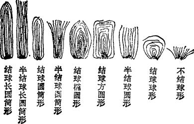 ②叶球形状 这是鉴定品种的重要性状。叶球可分为结球、半结球和不结球等(图29-2)。结球白菜可分为球形、圆形、圆筒形、长圆筒形。半结球白菜也可分为圆形,圆筒形和长圆筒形等。