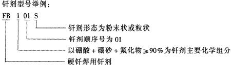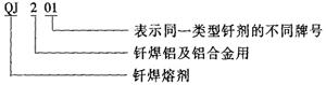钎剂牌号前加字母“QJ”表示钎焊熔剂;牌号第一位数字表示钎剂的用途,其中:1为银焊料钎焊用,2为钎焊铝及铝合金用;牌号第二、三位数字表示同一类型钎剂的不同牌号。