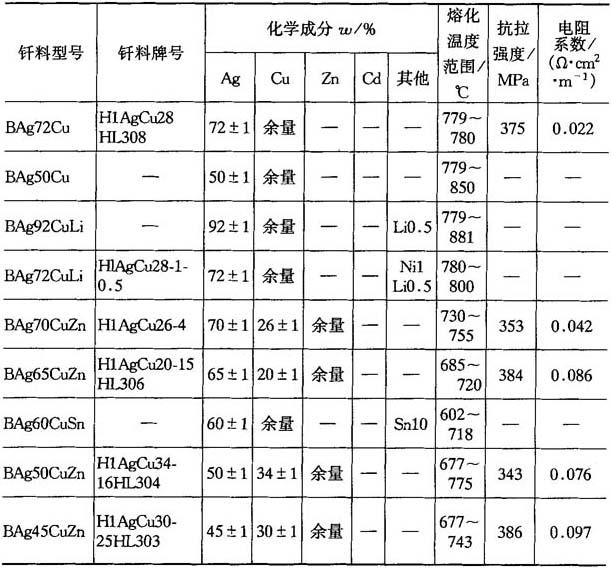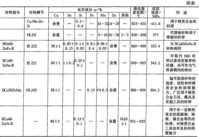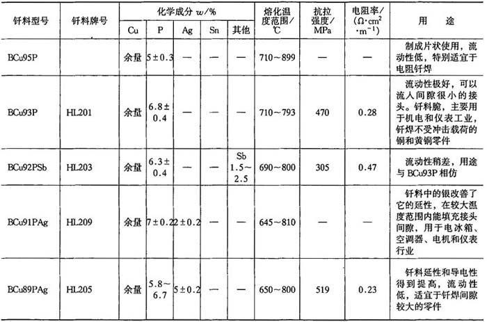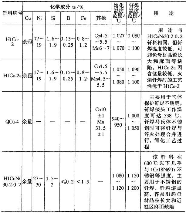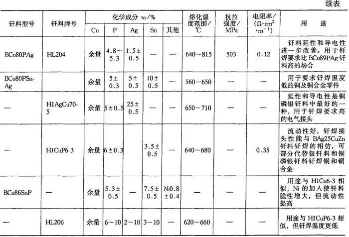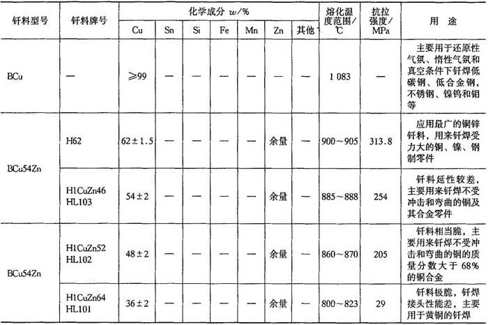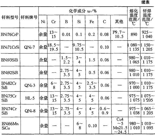 释义 | 钎料 钎料通常按其熔化温度范围分为两大类.液相线温度低于450℃的称为软钎料(也不恰当地称为易熔钎料).它们是镓基、铋基、铟基、锡基、铅基、镉基、锌基等合金.液相线温度高于450℃的称为硬钎料(也不恰当地称为难熔钎料).它们是铝基、镁基、铜基、银基、锰基、金基、镍基、钯基、钛基等合金. 各种常用钎料的特性及用途如表9-33~表9-39所示. 表9-33 锡铅钎料的特性及用途 ①括号内为冶金部部标钎料牌号 表9-34 铅基钎料的牌号和性能 表9-35 银基钎料化学成分和主要性能 表9-36 铜和铜锌钎料的特性和用途 表9-37 铜磷钎料的特性和用途 表9-38 高温铜基钎料特性及用途 表9-39 镍基钎料成分和特性 |