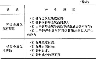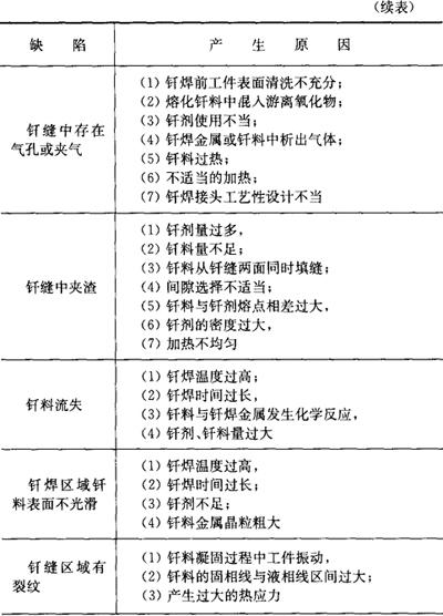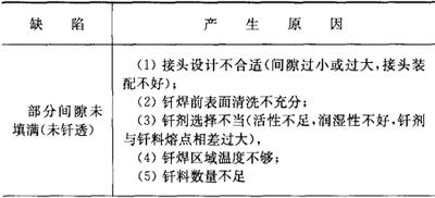 表9.1-9 钎焊接头中的缺陷及其产生原因