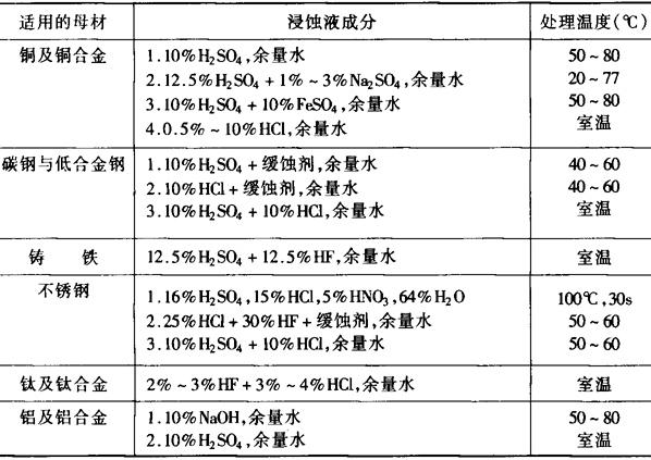 释义 | 钎焊表面准备 根据要求不同,对钎焊表面可进行清洗、镀覆、去除氧化物处理。只有将油、锈、氧化膜清除干净,工件才有可能被钎料润湿,才可能获得满意的焊缝。 1.清洗 为去除影响工件润湿性、降低填充效果的油污,常用有机溶剂、苛性钠溶液、磷酸三钠和碳酸氢钠水溶液清洗。有机溶剂有酒精、四氯化碳、汽油、三氯化烯、二氯乙烷、三氯乙烷、丙酮等。 小批量生产时,可将零件浸泡在有机溶剂中清洗。大批量生产时,可在有机溶剂蒸气中脱脂。此外将钢、铁零件浸泡在70~80℃的10%的苛性钠溶液中脱脂效果也佳。铜及铜合金零件可浸泡在60~80℃的磷酸三钠50g+碳酸氢钠50g+水1000g的溶液中进行脱脂。要求不高的零件也可用洗涤剂去污脱脂。对于大批量小型、复杂形体的零件为提高清洗效率和清洗质量,可采用超声波去污。即在专用槽中加清洗液,用超声波振动清洗液增强洗涤效果。 2.去除氧化物 去除氧化膜可用机械方法或化学方法。单件生产可用锉刀、砂纸、金属刷手工清理。小批量生产时,可用喷砂、砂轮、机动金属刷清理。大批量生产、要求高生产率和高可靠性时,可采用化学方法清理。化学方法清理后应进行光亮处理和水冲洗。表8-9是化学浸蚀液的配方成分。表8-10是电化学浸蚀液的配方成分及工艺参数。表8-11是光亮处理的规范。 表8-9 化学浸蚀液成分 表8-10 电化学浸蚀液成分及规范参数 表8-11 光亮处理的规范参数 3.表面镀覆 在母材表面镀覆一层金属,其目的是改善钎焊性,增加钎料对母材的润湿性,减少母材与钎料的互相作用,避免有害相的生成。镀层作为钎料,可减少放置钎料的麻烦,简化生产过程,提高生产率。镀覆的方法有电镀、化学镀、热浸沾、轧制包覆等。镀覆的方法及作用见表8-12。 表8-12 镀覆的方法及作用 |