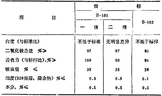 按不同用途对于含量、细度、杂质最高允许含量指标有不同的规定。TiO2含量一般在95.0~98.5%。其中《颜料用锐钛型二氧化钛》按中华人民共和国化学工业部标准HG1-790-76