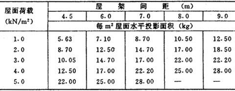 (2)本表不包括檩条间的支撑重量,需要时每m2应增加:用圆钢作时为1.0千克,用角钢作时为1.8千克。