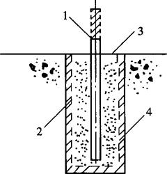 图7-74 套管法预埋地脚螺栓 1-预埋螺栓;2-无收缩砂浆;3-混凝土面;4-套管 直埋法容易出现较大的偏差,套管法对保证地脚螺栓质量有利,但施工复杂、费用较高。 5.基准标高的实测 在柱基中心表面和钢柱底面之间,考虑到施工因素,设计时都留有一定的间隙作为钢柱安装时的柱高调整,规范规定为50mm。基准标高点一般设置在柱基底板的适当位置,四周加以保护,作为整个钢结构工程施工阶段标高的依据。以基准标高为依据对钢柱柱基进行标高实测,将测得的标高偏差在图中标明,作为临时支承标高调整的依据。 |