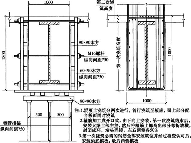释义 | 钢骨混凝土结构的施工方法 钢骨混凝土结构的施工是比较复杂的,为便于说明施工方法,现以某地区邮电信息枢纽大厦工程为例,比较详细地介绍钢骨混凝土大梁的施工过程和方法。 某地区邮电信息枢纽大厦裙楼中部6、7、8、9轴线的F列和J列柱位有0.55m×1.00mm型钢柱8根,并分别在4层、5层、9层(标高分别为13.87m、19.17m、39.17m)的F列和J列之间设有24m跨度的钢骨混凝土大梁。梁中设有0.5m×1.5m的“工”字形型钢梁,4层楼板共设有1.0m×1.8m、跨度为24m的钢骨混凝土大梁4根;柱间的净空为22.65m。每根大梁混凝土量为41m3、耗钢筋量8.5t;4根大梁共计混凝土量164m3、钢筋34t。钢骨大梁在梁中H、G列上设有尺寸600mm×600mm的柱子,其余与4层楼层相同。 (一)型钢梁的安装方法 型钢梁均为“工”字形型钢断面,上下翼缘板厚60mm,中间腹板厚40mm。型钢梁每米重为900kg,型钢梁的总重为254t,连同安装结点附加构件在内,总重量约为260t。型钢梁全部在专业加工厂按照设计图纸分段制作,分段运到施工工地,在现场用东区H3/36B型塔吊进行安装。型钢梁梁段的最大长度为9.7m。由于型钢梁设计长度超出原料板材长度,总重量也超过塔吊的起重能力,因此必须在加工车间分段加工制作,在现场分段吊装和拼装,各段之间的拼装采用“X”型焊缝。 为了满足分段安装的需要,需设置临时钢柱予以支承。临时钢柱高8050mm,用角钢组合焊接,配合4根钢梁逐榀进行安装,在4个轴线间周转使用。临时柱顶支座不拆除,最后浇筑在小柱端部混凝土内。 型钢梁安装由西向东进行,对于第一段是悬臂安装,除了在梁底靠近端头梁柱间设安装支承结点外,并在梁顶端头梁柱间设吊挂结点。 型钢大梁拼装焊接完毕以后,拆除临时立柱,土建施工钢筋混凝土大梁,此时型钢大梁已形成24m的跨度,并且不可避免地将承担部分工程的施工荷载。为了确保型钢大梁的稳定,在钢筋混凝土大梁开始施工以前,应全部完成下部楼层型钢梁及相应型钢柱的安装施工,形成组合框架的构造形式。 (二)模板支撑系统 模板支撑系统,拟采用钢管架支撑将施工荷载直接传到首层楼板。由于本工程大梁所在位置的下方,3层是大空洞,必须从2层楼板开始架设大梁底部的模板支撑。支撑用3根Φ48mm×3.5mm的钢管组成宽度为1m的排架。排架沿梁轴线按750mm间距纵向布置,与模板木方的布置相互协调,水平横杆间距1m,并设置剪刀撑,整个支撑体系与楼层内满堂脚手架联为一体,以加强整体的稳定。排架底部用60mm×90mm木方沿纵长方向垫底,以保证用均布荷载方式向下方传递荷载。 (三)钢筋工程的施工 在钢骨混凝土大梁施工时,应先进行绑扎钢筋工作,后安装底部模板和两侧模板。由于型钢梁已经安装就位,底部钢筋的安装作业必须在型钢梁下面进行,所以底部模板的安装只能推迟到钢筋就位之后。 在安装钢筋时,可利用已经安装就位的型钢梁架设扁担式钢筋支承架,其具体做法是:用直径28mm的钢筋作上下钢筋扁担。上扁担焊接固定在型钢梁的上翼缘,并用斜撑与型钢梁腹板焊接;下扁担悬挂在中心距梁底50mm的高度,通过两个吊环上挂并固定在上扁担的两头。 扁担式钢筋支承沿大梁纵向每8m设置3组。在支承纵向受力钢筋的同时,并控制大梁宽度尺寸和负责侧模的定位。为此,支承架的安装就位,必须按照大梁轴线对中就位。待梁底钢筋全部安装就位后,由下向上逐一穿开口式箍筋。 梁底和梁顶纵向受力钢筋在两端头要进行处理,处理的具体方法是:通过焊接角钢和钢板与型钢柱连接。该角钢和钢板在支承和焊接大梁上下主受力钢筋的同时,还需要解决主筋垂直相交和通过的问题。为此,在柱筋穿过处布置直径为36mm的钻机,钻孔中心间距为75mm,从孔内穿过直径28mm的主筋,两孔之间焊接直径为36mm的梁主筋,垂直相交,纵横紧靠,基本上没有间隙。 焊接的角钢和钢板负责保证梁钢筋和柱钢筋的交错和严格的尺寸标高定位,作用十分关键。其加工和在柱梁翼板上的安装焊接,必须高度准确,如果出现偏差,将给梁柱的安装就位带来很大困难。 由于柱筋在穿过焊接角钢和钢板的同时,也将要穿过型钢梁的上、下翼缘,因此,在上、下翼缘板的相应位置应布置相同的直径36mm钻孔。 由于柱主筋必须穿孔就位,因此,必须先在型钢柱、梁焊接角钢和连接钢板,然后由上向下穿孔安放钢筋。柱主筋焊接接头的位置宜布置在楼层的第三层。 (四)模板工程的施工 第一次浇筑混凝土所需钢筋全部安装就位后,便可安装底部的模板,最后安装两侧模板。底部模板一般可采用七层的胶合板,板下纵向布置90mm×90mm木方4根,再下面是90mm×90mm的横木方。横木方间距为750mm,直接与底部钢管排架连接。 侧模也可采用七层的胶合板,纵向用4根90mm×90mm,竖向用2根60mm×90mm木方,间距为750mm。设M16对拉螺栓,每组3根,上下两排分别布置在型钢梁上翼缘顶面以上和下翼缘底面以下,中间一排穿过型钢梁腹板,为此,需要在型钢梁腹板中部与对拉螺杆对应处设直径为24mm的钻孔。对拉螺杆长1.6m,用黑铁皮管作为定距套管。螺杆沿大梁轴线纵向布置,间距750mm。模板安装及钢筋绑扎做法如图12-13所示。 图12-13 大梁模板、钢筋施工剖面图 (五)混凝土工程施工 混凝土浇筑应分两次进行,第一次浇筑到板底,浇筑高度为1650mm,第二次配合楼板浇筑,浇筑高度为150mm。 按照正常做法,全部钢筋就位完毕以后,支模并一次浇筑全部混凝土