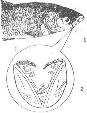 释义 | 钩介幼虫病 钩介幼虫病由河蚌的幼虫——钩介幼虫寄生在鱼的鳃部、嘴部、鳍和皮肤上而引起。钩介幼虫是由河蚌的受精卵在雌蚌的外鳃腔中发育而成,打开蚌壳肉眼可见。在每年的春季和夏季,成熟的钩介幼虫从雌蚌排到水中,然后寄生到鱼体上,吸收鱼体营养,在鱼体上进行变态,当钩介幼虫完成变态后,就从鱼体脱落下来,这时叫幼蚌。所以钩介幼虫是河蚌发育过程的一个阶段,而鱼又是钩介幼虫完成变态的必须宿主。 症状:病鱼离群独游,行动缓慢。肉眼仔细观察可见嘴部或鳍上有米色小点,即为该虫。该虫寄生在鳃部则鳃丝充血严重。 流行情况:此病的流行季节在每年的春末夏初,草鱼从鱼苗到夏花阶段生此病常常引起大批死亡。 预防方法: 1.用生石灰或茶饼清塘,彻底杀灭河蚌。干塘时河蚌常潜入淤泥中,因此,用茶饼清塘,必须将池水淹没所有池底淤泥处,才能达到彻底杀灭河蚌的目的。 2.河蚌与鱼苗到夏花阶段鱼种决不能混养,养蚌的池水亦不能让其流入鱼苗和夏花培育池。 治疗方法: 1.发动群众下水捞起河蚌。 2.一发现病情,就迅速将鱼转移到没有河蚌的池中饲养。 图24 钩介幼虫病 1.病鱼 2.钩介幼虫 |