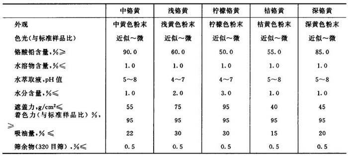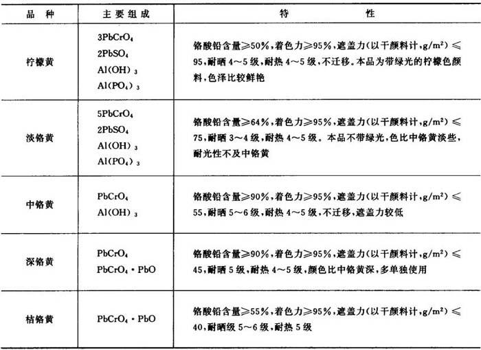 性质与用途 铬黄是铬酸铅或碱性铬酸铅与硫酸铅等不溶性盐的混合晶体。相对密度6.0~6.6。平均粒径0.2~1μm。颜色随成分而异,从淡黄色到橙色,通常将其分成柠檬黄、淡铬黄、中铬黄、深铬黄和桔铬黄五种。表18-1为各品种的组成与特性。