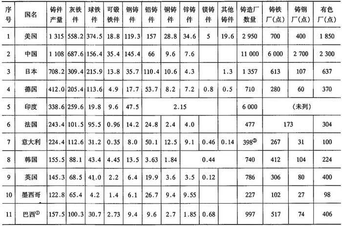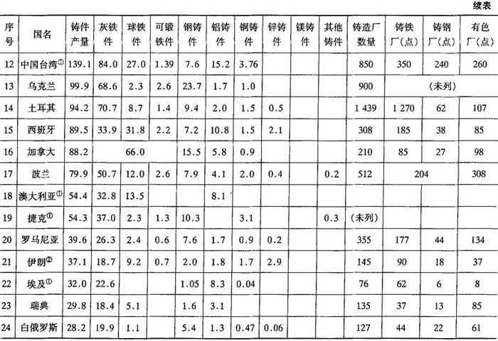①所列巴西、中国台湾、澳大利亚、捷克、埃及、阿根廷、荷兰、挪威的各项数据为1996年数据;②所列伊朗和南非的各项数据是1995年数据;③意大利铸造厂数量为1994年数据.