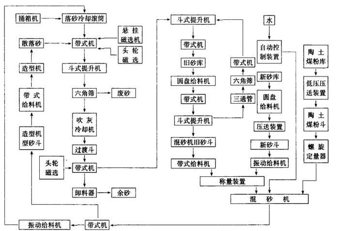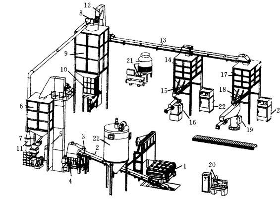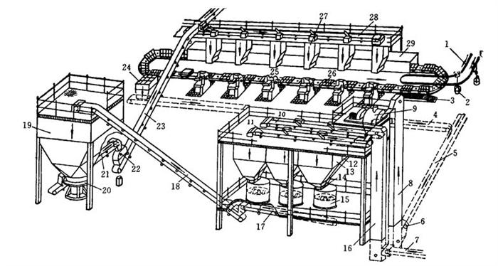 释义 | 铸造生产机械化 铸造生产实现机械化、自动化对于提高劳动生产率、提高产品质量、降低劳动强度、改善劳动环境有着重要的意义,是目前铸造生产亟待解决的课题.铸造生产是由不同工序联系在一起的工艺过程.从材料准备到铸件毛坯要经过砂处理、造型、浇注、落砂和清理一个完整的工艺生产过程,每个环节都非常重要,都是获得合格铸件的保证.下面介绍一个机械化程度较高的生产厂必须要具备的生产线. 砂处理是提供合格造型用砂的关键工序.它包括新旧砂处理;辅助料准备、定量、混制及输送系统.图3-21和图3-22是铸工车间砂处理系统的配备及布置示意图. 图3-21 砂处理系统工艺流程框图 造型是由若干台造型机组成的生产流水线来协调完成的.生产线由主机、辅机、输送系统和控制系统组成一条完全的机械化造型生产线可以大大提高生产率,并极好地解决造型生产中的困难,不但减轻劳动强度,还改善劳动条件,工人们可以通过控制系统、计算机来完成合格铸件的生产任务.图3-22是一条由六台Z148B组成的机械化造型生产线示意图.图3-23是由两台射压造型机组成的自动化造型生产线示意图.图3-24是一条树脂砂生产线示意图.从介绍的几条生产线来看,机械化生产虽然有诸多好处,但由于主机多、辅机多、占地面积大、投资大,而限定了只有大批量生产的厂家才是合适的.目前国内外针对这一问题,技术人员都在努力解决一机多用、简化辅机的高效高速自动化生产.如无箱挤压造型生产线是用一台主机完成上、下箱造型,配以下芯机构、浇注机械、落砂清理滚筒及装配有高速高效混砂机的砂处理系统.这种生产线占地面积小、设备少、机械化程度高.投资相对少的生产线是今后的发展方向. 图3-22 机械化砂处理、造型生产线 1—浇注单轨;2—浇包;3—浇注台;4、5、10—旧砂皮带运输机;6—电磁皮带轮;7、11—新砂皮带运输机;8—旧砂斗式提升机;9—滚筒筛;12、13—砂斗;14—定量器;15—混砂机;16—新砂斗式提升机;17、18、21、23、28—型砂皮带运输机;19—调匀斗;20—圆盘给料机;22—松砂机;24—落砂机;25—造型机;26—铸工输送器;27—型砂斗;29—通风冷却罩 图3-23 射压造型自动生产线 1—分箱机;2—上砂箱滚道;3—上砂箱转向机;4—上箱射压造型机;5—下砂箱滚道;6—下砂箱转向机;7—下箱射压造型机;8—空芯盒翻转机;9—射芯机;10—芯盒转向机;11—下芯机;12—下芯翻转机;13—开芯盒机;14—合箱机;15—落箱机;16—铸工输送器;17、20—压铁装置;18—浇注平台;19—浇注环轨;21—冷却通风罩;22—推杆;23—捅箱、落砂机;24—鳞板输送器;25—旧砂吸送管道;26、31、32—旋风卸料器;27—磁选皮带机;28—增湿器;29—沸腾冷却器;30—新砂吸送管道;33—螺旋给料器;34—混砂机;35—压送发送器;36、37—压送管道;38—型砂卸料器;39—芯砂卸料器;40—电磁气阀箱 图3-24 树脂砂生产线示意图 1—TYL型落砂机;2—带式输送机;3—S975永磁皮带轮;4—TYP型破碎机;5—斗式提升机;6—No.1砂库;7—TYZ型气力再生机;8—TYF型旋风分离器;9—No.2砂库;10—TYW型砂温调节器;11—振动输送机;12—斗式提升机;13—带式输送机;14—No.3砂库;15—带式输送机;16—TYH-0.5混砂机;17—No.4砂库;18—带式输送机;19—TYH-10混砂机;20—TYD型电气控制柜;21—水冷系统;22—除尘器 浇注目前是由许多先进的浇注设备来完成的,大多配备在生产线上自动控制. 落砂清理冷却一体化是目前在流水线上使用较多的一种设备,特别是配置在射压线上更能发挥作用. |