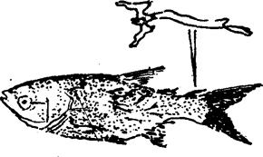 图4-26 锚头鳋病 虫体细长如针,分头、胸、腹三部分,但体形会发生变化,身体拉长,体节愈合成筒状,头胸部长出头角,雌性锚头鳋始终保持剑水蚤型的体形。 症状 多态锚头鳋寄生在鳞片较小的鲢鳙鱼皮肤上,可引起周围组织红肿发炎,形成似石榴子般的红斑。鲤锚头鳋、鲩锚头鳋寄生在鲤、鲫鱼和草鱼等披有较大鳞片的皮肤上,寄生部位的鳞片被蛀成缺口,周围组织出现红斑,病鱼焦燥不安,食欲减退,继而身体消瘦,游动缓慢而死。7-10厘米的鱼种患病后可引起鱼体畸形弯曲,失去平衡。由于虫体前半部钻在鱼体组织内,后半部露在外面,严重感染时,鱼体似披 流行情况 此虫危害多种淡水鱼类,尤以鲢、鳙鱼的鱼种为甚。全国各养鱼场广为流行。水温15-33℃(即4-10月)时,为锚头鳋的繁殖季节,也是此病的流行季节,其中以秋季为最严重。 防治方法 ①用生石灰清塘,可杀灭幼虫以及带有成虫的鱼和蝌蚪;放养鱼池加注新水,应加过滤设施,防止幼虫随水流入池内。 ②每立方米水用10-20克高锰酸钾溶液,浸洗鱼种1.5-2小时。 ③每立方米水用0.3-0.5克90%晶体敌百虫全池泼洒,每隔7天用药一次,连续2-3次。 ④每亩水面用酒糟20-25公斤全池泼洒。从第二天开始,每天投喂酒糟2.5-5公斤,连续4-6天。 ⑤每亩水深1米,泼洒氨水5-6.5公斤,既治病又肥水。 ⑥亲鱼池发病,每亩放黄 ⑦鳗鱼池可用90%晶体敌百虫全池泼洒,每隔3-4天泼一次,连泼3次。每立方米水第一次用0.6克,第二次用0.4克,第三次用0.3克。 ⑧每亩用10-15公斤青松毛或枫杨树枝叶,扎成5-6捆,插挂在食场周围,或捣碎浸汁后全池泼洒。 ⑨每亩用苦楝树根11公斤,桑叶10公斤,麻饼或土饼11公斤,菖蒲12.5公斤碎碎混合,全池泼洒。 ⑩每亩用60公斤大茶叶(胡蔓藤),扎成数束散放塘中,约7-8天后,大部分虫体可以杀死。 ⑾每亩用五加皮75-100公斤,分成数束,使茎叶浸在水里,树头露出,6-7天后,虫体脱落。 ⑿每亩水深1.3-1.7米,每次用牛血(猪血)5公斤,与浸泡磨碎的精料混合,全池泼洒,连喂3天。 ⒀用雷丸和石榴皮各100克,加水10公斤,煎熬4-5小时,至2.5公斤左右时,用水稀释至10公斤,浸洗病鱼20-30分钟,3-4天后,虫体脱落,伤口也愈合。 ⒁每亩用松树叶10-15公斤,捣碎浸出汁,全池泼洒。 ⒂每亩水深0.8米,用棉子0.75公斤焙炒将熟,磨碎拌桐油200克,再以饲料调匀撒于鱼种塘中,2-3天后见效。 ⒃上午8时,每亩用30-50毫升松节油,浸洗病鱼10-15分钟; ⒄有的生产单位利用换塘法,改变鱼的生活环境,即把肥水塘中的鱼搬到瘦水塘中饲养,反之也行,可使虫体脱落;有的生产单位认为鲢、鳙鱼与罗非鱼混养,无此病发生。 |