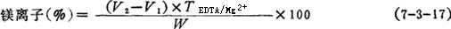 (三)测定手续 吸取25.00ml样液(含镁离子1~12mg),加5ml氨性缓冲溶液,4滴0.2%铬黑T指示液,用0.02mol/L EDTA标准溶液滴定至亮蓝色(EDTA用量为测定钙、镁离子总用量)。