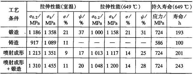 喷射成形In718合金的室温和650℃屈服与持久强度及持久寿命高于铸锻态合金,塑性也保持了较高的水平.当施以热等静压处理后,室温与高温性能大为改善,见表9-13.