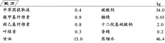 然后,将甘油、十二烷基硫酸钠、叶绿素、糖精、香精与刚制得的中草药提取物混合,加入部分蒸馏水,搅拌混合均匀。