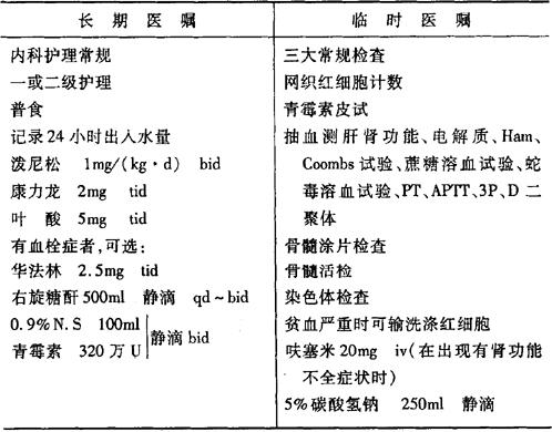 说明:(1)有血栓并发症者,在使用华法林时,必须注意凝血常规的监测,肝素可诱发溶血,应慎用。