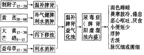 【注意】 本方为脾肾阳虚,湿浊内盛的尿毒症而设,若湿热内盛者不宜使用本方。