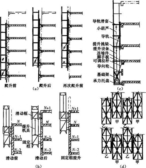 (a)导轨式;(b)主套架式;(c)悬挑式;(d)吊拉式