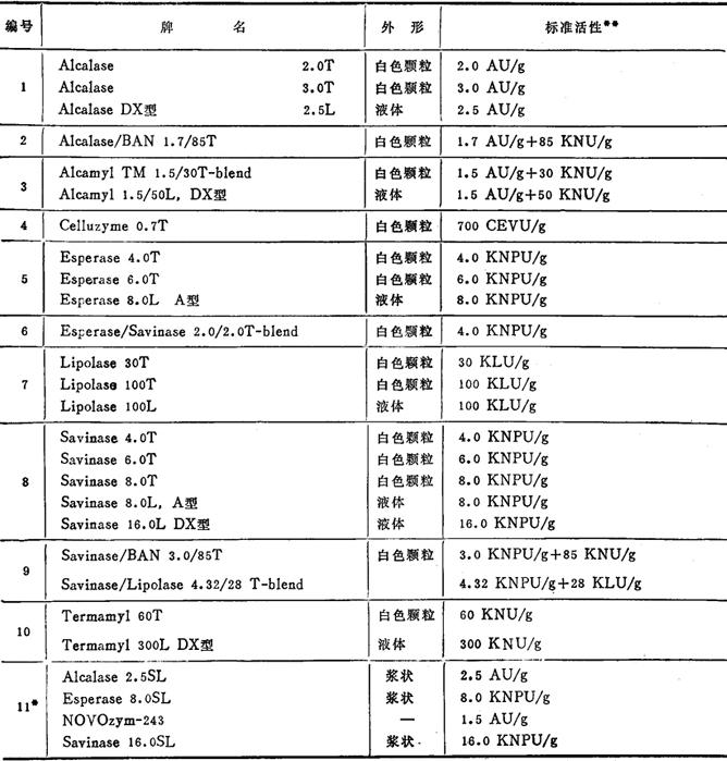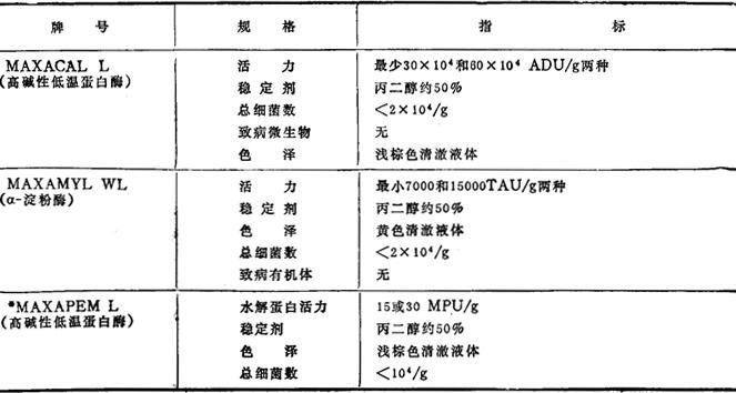 释义 | 附:KL-碱性蛋白酶 性能 蓝绿色颗粒。是合成洗涤剂专用酶,其主要成分是2709碱性蛋白酶,以三聚磷酸钠为载体,能分解蛋白质成氨基酸或肽,使之成为水溶性的低分子物。配入洗涤剂中在pH9~12、40~50℃能有效地去除汗迹、污渍和含有蛋白质之类的食物污渍。 质量规格 外观 蓝绿色颗粒 细度 16目筛下物 酶活力 20000单位/g 气味 无不愉快气味 用途 用于洗衣粉中,制成加酶洗衣粉,1.0克洗衣粉含KL-碱性蛋白酶500~1000个单位。 包装贮运 贮存时间暂定一年,失活不超过20%。用塑料桶包装,每桶30kg,贮存时应装于密封的塑料桶内或装于聚乙烯塑料袋中,然后放入硬纸箱中,在阴凉、通风、干燥、避日晒雨淋处存放。 国内生产厂 天津酶制剂厂、上海新型发酵厂、江苏无锡酶制剂厂、浙江德清酶制剂厂、北京通县酶制剂厂。 国外生产公司(厂) 丹麦NOVO公司、荷兰国际生物合成品公司等。 国外质量规格参考 见以下各表。 国外洗涤剂酶质量(一)(丹麦NOVO公司) NOVO 酶的分类 蛋白酶:Alcalase,Esperase,Savinase NOVOzym-243,AlcamylTM。 α-淀粉酶:BNATermamyl。纤维素酶:Celluzyme。脂肪酶: Lipolase。 NOVO酶的产品 国外洗涤剂酶质量(二)(荷兰国际生物合成品公司) |
