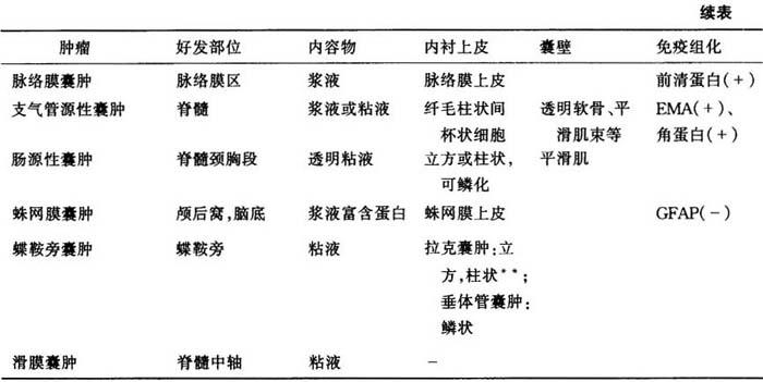 中枢神经系统囊肿众多,归纳分为两大类:一类为神经上皮或内、外胚叶上皮被覆囊肿;另一类为无上皮被覆囊肿。常见囊肿及其主要鉴别点见表9-29。