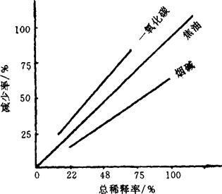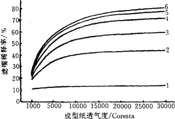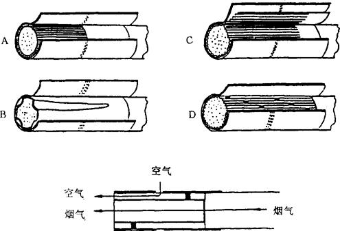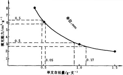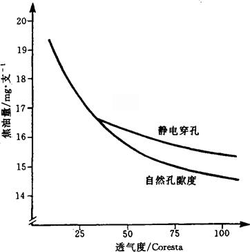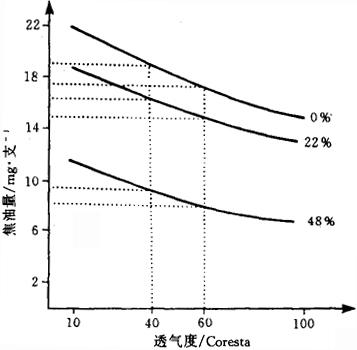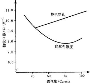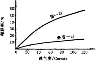 释义 | 降低卷烟焦油量的方法 降低卷烟焦油量的方法包括:减少每支卷烟燃烧物的质量(重量),减少吸烟时通过燃烧锥的空气量,将主流烟气中的粒相物质截留和减少烟支的抽吸口数。 (一)选择合适的烟叶原料与提高烟丝填充值 1.选择合适的烟叶原料 不同产地、类型、部位及等级的烟叶因组织结构、化学组成不同,其密度和燃烧性能有很大差异。燃烧后焦油产生量明显不同。见表6-4-1所示。 表6-4-1 烤烟(40级)烟叶理化特性试验结果 注:试验条件:1.试验烟叶为河南省1993年烤烟(40级)国家标准仿制样品。 2.吸湿性以平衡含水率表示。 3.样品平衡环境:温度(22±2)℃,相对湿度(60±5)%。 4.焦油测定:标准吸烟条件:烟丝宽度0.8mm,烟支规格70mm×25mm。 单支质量(重量)允差 ±0.02g,烟支吸阻(588±245)Pa。 2.提高烟丝填充能力 提高烟丝填充能力是减少烟丝用量、降低卷烟焦油量的重要途径。烟丝的长度、宽度和含末量直接影响着烟丝的填充能力和卷烟焦油量。 填充能力与烟丝长度、单支含丝量、烟丝含末量的关系见图6-4-1,图6-4-2及图6-4-3所示;烟丝宽度与烟丝填充值的关系见图6-4-4所示。 图6-4-1 烟丝长度对填充能力的影响 图6-4-2 烟丝填充能力与单支含丝量的关系 图6-4-3 烟丝含末量对填充能力的影响 图6-4-4 烟丝宽度与烟丝填充值的关系 试验条件:空气温度20℃ 相对湿度65% 河南中三含水率:12.3%~12.85% 云南中三含水率:11%~12% 在烟丝填充能力较低的范围内,即使填充能力稍有增大也会大量降低单支含丝量;烟丝填充能力分别在6cm3/g和3cm3/g时,填充能力增加0.5cm3/g,单支含丝量分别降低0.05g/支和0.17g/支。 利用膨胀烟丝和膨胀梗丝,能有效提高烟丝的填充能力。卷烟单箱耗丝量减少;抽吸口数减少,可有效减少烟气焦油量。 膨胀烟丝与卷烟单支含丝量、烟气焦油量的关系,见图6-4-5及图6-4-6所示。 图6-4-5 膨胀烟丝与单支含丝量的关系 图6-4-6 膨胀烟丝与烟气焦油减少率的关系 3.利用烟草薄片 不同工艺方法制造的薄片,对降低卷烟焦油的效果有较大差异。造纸法生产的薄片密度小,有较高的填充能力和较强的燃烧性能,其焦油量约为天然烟叶的50%。辊压法生产的薄片密度大,降低焦油的效果较差。 辊压法和造纸法薄片降低卷烟焦油量的效果,见表6-4-2及图6-4-7所示。 表6-4-2 辊压法薄片与卷烟焦油量的关系 注:试验条件:标准吸烟条件。 烟支规格:84(20+64)mm×24.5mm,滤嘴吸阻540Pa。 图6-4-7 造纸法薄片对焦油量的影响 (二)减少通过燃烧锥的空气量 烟支主流烟气中的各种组分分别来源于烟支燃烧时的产物和不经燃烧锥直接进入烟支中的空气。部分空气直接进入烟支,减少通过燃烧锥的空气量,降低了各种燃烧产物在每口烟气中的相对量。 1.提高卷烟纸透气度 自然孔隙度卷烟纸、静电穿孔卷烟纸与烟气焦油量的关系,见图6-4-8所示。 图6-4-8 卷烟纸透气度对烟气焦油量的影响 烟支抽吸过程中,前后抽吸的烟气稀释率不同,见图6-4-9所示。 图6-4-9 卷烟纸透气度对稀释率的影响 2.通风稀释 通风稀释是指通过在卷烟滤嘴上打孔形成通风滤嘴,将空气引入卷烟的主流烟气中,使主流烟气中所有成分的相对量降低,同时降低经燃烧锥进入烟支的气流速率,提高滤嘴的过滤性能,减少烟气焦油量。由通风滤嘴取得的烟气稀释率在烟支整个抽吸过程中相对稳定。 通风滤嘴组成结构和通风滤嘴截面结构,见图6-4-10及图6-4-11所示。 图6-4-10 通风滤嘴组成结构示意图 图6-4-11 通风滤嘴截面结构示意图 (1)滤嘴打孔方式:滤嘴打孔通常分为在线打孔和接装纸预打孔两种方式。 ①在线打孔:在线打孔是指烟支在接装后打孔。采用机械和激光打孔。机械打孔已被淘汰;目前世界上有10%左右的通风滤嘴卷烟采用在线激光打孔。 ②接装纸预打孔:预打孔的接装纸与高透气度成型纸成型的滤棒或无包纸滤棒组成通风滤嘴。为保证接装纸的打孔位置不被粘接剂堵塞,接装纸打孔位置不能上胶。 接装纸预打孔采用机械、静电和激光打孔三种方法。机械及静电打孔很少使用;激光打孔应用广泛。 激光预打孔接装纸型式,见图5-3-1所示。 (2)通风稀释率:通风稀释率的测定,见图6-4-12所示。 图6-4-12 通风稀释率测定示意图 通风稀释对主流烟气的影响取决于通风稀释率。通风稀释率指经滤嘴通风孔进入主流烟气中的空气体积与主流烟气总体积的百分比。用下列公式表示: 式中 D——滤嘴通风稀释率,%; Vf——经滤嘴通风孔进入主流烟气中的空气体积,mL; Vt——主流烟气总体积,mL。 滤嘴通风稀释率也可以烟支各段的吸阻为参数,运用理论公式计算。烟支各段吸阻测量位置,见图6-4-13所示。 图6-4-13 吸阻测量位置示意图 ①滤嘴通风稀释率——单排孔 ②滤嘴通风稀释率——多排孔 ③滤嘴通风稀释率——多孔性接装纸 ④烟条通风稀释率——多孔性卷烟纸、非多孔性接装纸 ⑤烟条通风稀释率——多孔性卷烟纸、通风滤嘴 ⑥总通风稀释率——D=Dt+Dt 式中 △Q——稀释气流量,cm3/s; Q——出口端总气流量,cm3/s; △po——不封闭时烟支吸阻,Pa; △pe——全封闭时烟支吸阻,Pa; △pc——滤嘴封闭时烟支吸阻,Pa; △pf——滤嘴头封闭时嘴头吸阻,Pa L1——嘴端到通风孔的距离,mm; Lf——滤嘴长度,mm △L——相邻两排通风孔之间的距离,mm; Lc——外包接装纸的长度,mm; Lo——未包接装纸的烟条长度,mm; n——打孔排数; Df——滤嘴通风稀释率,%; Dt——烟条通风稀