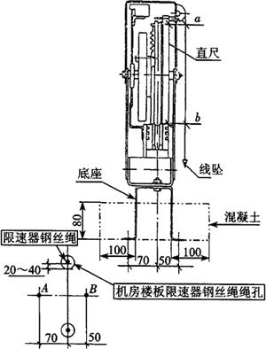 释义 | 限速器的安装 限速器是当电梯达到预定速度时能使其停止,并使安全钳动作的一种装置。安装在机房内或井道顶部,其涨紧装置设于底坑内。安全钳和限速器必须联合动作才能起制停电梯的作用。当轿厢速度异常增大时,经限速器检测,若速度达到115%额定速度值前,限速开关动作并切断电动机电源;当速度达到或超过115%额定速度时卡住限速器钢丝绳,提拉安全钳钳块拉杆,安全钳动作。安全钳不复位,电梯不能重新使用。要求限速器动作灵敏,其响应时间控制在0.5s以内。按动作原理可分摆锤式和离心式。摆锤式又分下摆锤式限速器和上摆锤式限速器。离心式分垂直轴转动式(甩球式)和水平轴转动式(盘式)。目前,大多采用水平轴转动式。高速梯上采用的甩球式属垂直轴转动式。从速度采集分,摆锤式属于非连续捕捉型;离心式属于连续捕捉型。从对钢丝绳产生制动力分,有夹绳式和无夹绳装置的曳引提拉式。 请注意:所有的限速器在出厂时,都经过了严格的调试检验,安装时不允许随意调整任何影响限速器工作的部位,以免影响限速器正常工作。 限速器的安装很简单,根据前面已确定的限速器钢丝绳中心位置,在机房地面标出限速器底座安装孔的位置,详见图8.3-1中的A、B两点。在A、B处,打入M12膨胀螺栓,装上限速器底座,拧紧膨胀螺栓的螺母。 图8.3-1 限速器安装示意 将限速器放在底座上,放置时应注意限速器的方向,必须使限速器的工作方向与电梯的运行方向一致。用螺栓将限速器固定在底座上,稍微紧固。使用线坠测量限速器绳轮的垂直度,要求如图8.3-1中的a、b两点的偏差小于0.5mm,然后紧固安装螺栓。 最后需要用混凝土固定限速器底座,混凝土台阶高80mm,每边凸出限速器底座边缘100mm。 |
