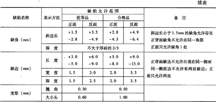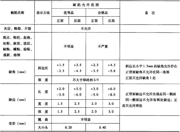 释义 | 陶瓷锦砖的技术质量要求 陶瓷锦砖的技术质量要求,主要包括尺寸允许偏差、外观质量、物理力学性质和整联质量要求等。 (一)尺寸允许偏差 单块砖的尺寸和每联锦砖线路、联长的尺寸及其允许偏差应符合表16-20中的规定。 表16-20 单块砖的尺寸和每联锦砖线路、联长的尺寸及其允许偏差 (二)外观质量 陶瓷锦砖边长≤25mm的外观质量缺陷允许范围应符合表16-21中的规定,陶瓷锦砖边长>25mm的外观质量缺陷允许范围应符合表16-22中的规定。 表16-21 陶瓷锦砖的外观质量缺陷允许范围(边长≤25mm) 注:在缺陷允许范围内,优等品正背两面各限两种缺陷,合格品正背面各限4种缺陷。 表16-22 陶瓷锦砖的外观质量缺陷允许范围(边长>25mm) 注:在缺陷允许范围内,优等品正背两面各限两种缺陷,合格品正背面各限4种缺陷。 (三)物理力学性质 根据标准《陶瓷锦砖的质量标准》(JC456-92)中对陶瓷锦砖的技术性能的具体要求,应符合表16-23中的规定。 表16-23 陶瓷锦砖的技术性能 (四)成联质量要求 锦砖与铺贴材料的粘结,不允许有脱落,正面贴纸陶瓷锦砖的脱纸时间不大于40min,锦砖铺贴成联后不允许铺贴纸露出。联内、联间锦砖的色差,优等品目测基本一致,合格品目测稍存在一定色差。 |
