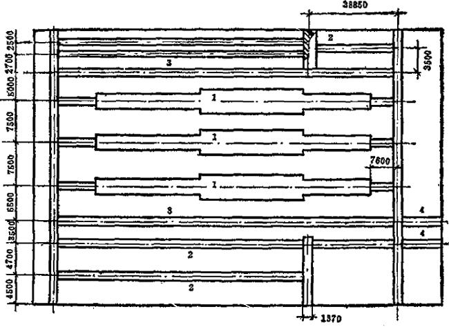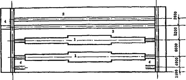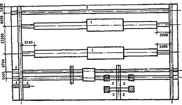 释义 | 隧道窑布置 (一)一条隧道窑布置(图7-21) 图7-21 太钢80.84m耐火材料隧道窑布置图 1条隧道窑,一般设装卸车道(序号2)、回车道(序号3)各1条,存车和检修车道(序号4)半条以上(其中应能保证容纳3-4个检修车位),若装卸车道在窑的一端,则存车道也需1条。厂房面积:22m(跨度)×120m(长度)=2640m2。厂房桁架下沿高度;5.5m。 (二)二条隧道窑布置(图7-22、图7-23 图7-22 西安高压电瓷厂116m煤气烧电瓷隧道窑布置图 图7-23 咸阳陶瓷厂87m卫生瓷隧道窑布置图 2条隧道窑的烧成车间,装卸车道(序号2)应设1条以上,回车道(序号3)1条,存车和检修车道1条以上:若两条窑所烧产品不同,窑车不能通用(有棚板)时,应另考虑增加回车道为2条。 (三)三条隧道窑布置(图7-24) 图7-24 景瓷97m隧道窑(日用瓷)布置图 图中 厂房面积——45m(多跨)×138m(长度)=6210m2:其中窑炉占地5400m2,堆放匣钵占地45m×12m=540m2,办公室、控制室、检修窑车占地45m×6m=270m2窑车数量——窑车总数300辆;其中窑内48辆×3=144辆,窑外156辆。 |