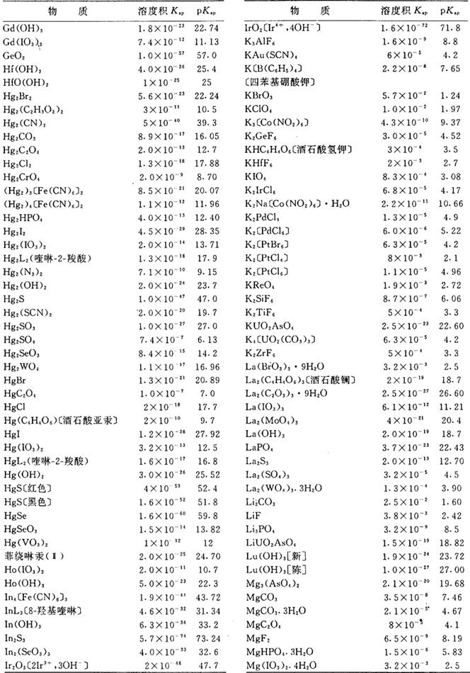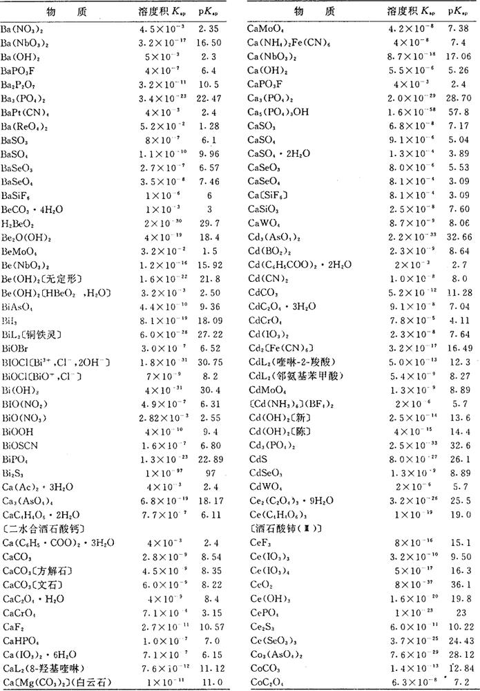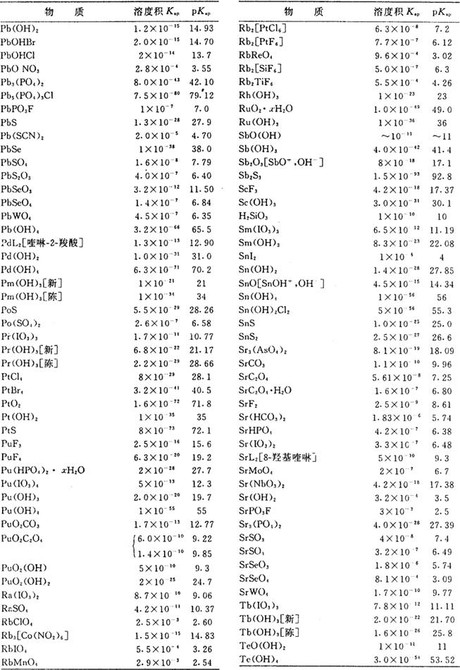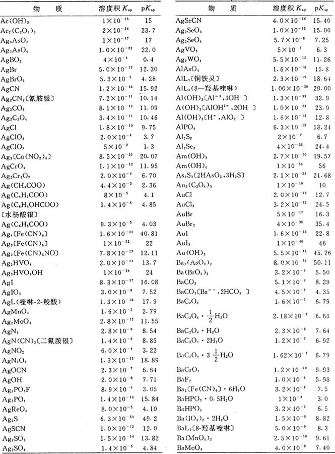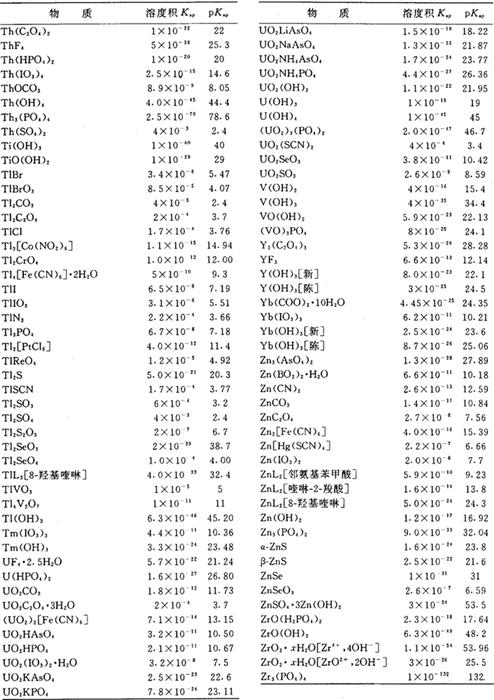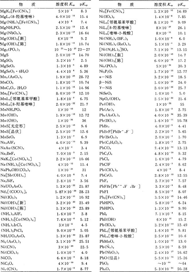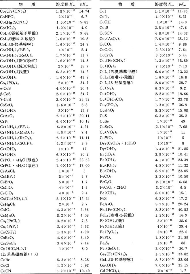 本表所列溶度积为18~25℃的数值、是的负对数。(物质化学式中L代表配体,其后括号中是配体的名称)。
