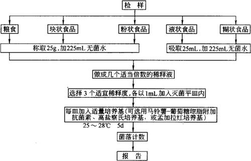 释义 | 霉菌的检验 1.培养基和试剂 (1)马铃薯葡萄糖琼脂(PDA),附加抗菌素,按本节九 (三)31规定。 (2)孟加拉红培养基:按本节九 (三)32规定。 (3)高盐察氏培养基:按本节九 (三)30规定。 (4)灭菌蒸馏水。 (5)乙醇。 2.检验程序 霉菌检验程序见图4-2-14。 图4-2-14 霉菌检验程序 3.操作步骤 (1)采样:取样时需特别注意样品的代表性和避免采样时的污染。首先准备好灭菌容器和采样工具,如粮食(包括粮库贮粮,粮店或家庭小量存粮)样品的采集,可根据粮囤或粮垛的大小和类型,分层定点取样,一般可分三层五点,或分层随机采取不同点的样品,充分混合后,取500g左右送检。小量存粮可使用金属小勺采取上、中、下各部位的混合样品。 海运进口粮的采样:每一船舱采取表层、上层、中层及下层4个样品,每层从五点取样混合,如船舱盛粮超过10000t,则应加采一个样品。必要时采取有疑问的样品送检。 谷物加工制品(包括熟饭、糕点、面包等)、发酵食品、乳及乳制品以及其他液体食品,用灭菌工具采集可疑霉变食品250g,装入灭菌容器内送检。 (2)以无菌操作称取检样25g(或25mL),放入含有225mL灭菌水的玻塞三角瓶中,振摇30min,即为1∶10稀释液。 (3)用灭菌吸管吸取1∶10稀释液10mL,注入管中,另用带橡皮乳头的1mL灭菌吸管反复吹吸50次,使霉菌孢子充分散开。 (4)取1mL1∶10稀释液注入含有9mL灭菌水的试管中,另换一支1mL灭菌吸管吹吸5次,此液为1∶100稀释液。 (5)按上述操作顺序做10倍递增稀释液,每稀释一次,换用一支1mL灭菌吸管,根据对样品污染情况的估计,选择了3个合适的稀释度,分别在做10倍稀释的同时,吸取1mL稀释液于灭菌平皿中,每个稀释度做2个平皿,然后将晾至45℃左右的培养基注入平皿中,待琼脂凝固后,倒置于25~28℃恒温箱中,3d后开始观察,共培养观察5d。 (6)计算方法:通常选择菌落数在10~150的平皿进行计数,同稀释度的2个平皿的菌落平均数乘以稀释倍数,即为每克(或毫升)检样中所含霉菌和酵母数。 (7)报告:每克(或毫升)食品所含霉菌和酵母数以个/g(个/mL)表示。 |