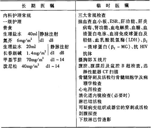 说明:(1)本化疗方案为治疗HD的标准方案之一,即MOPP方案;亦可用环磷酰胺(CTX)600~800mg/m2代替氮芥,则为COPP方案。该方案用药两周、休息两周为一疗程,推荐使用6个疗程,或达完全缓解(CR)后再加2疗程;另一有效的方案为ABVD方案,即阿霉素、搏来霉素、长春碱和甲氮咪胺。