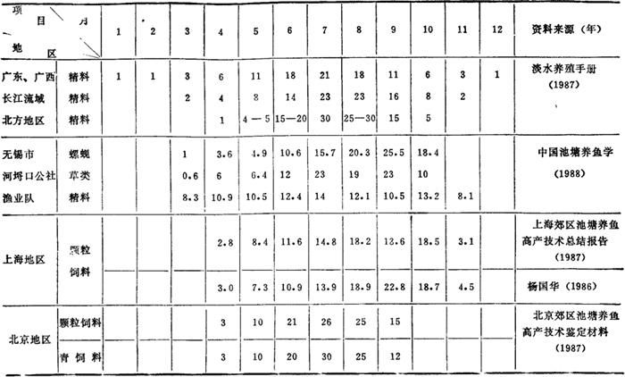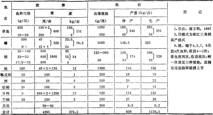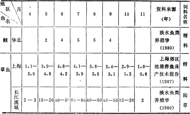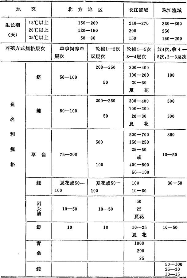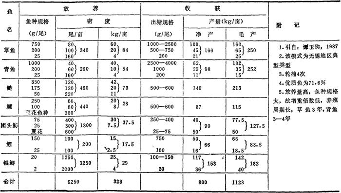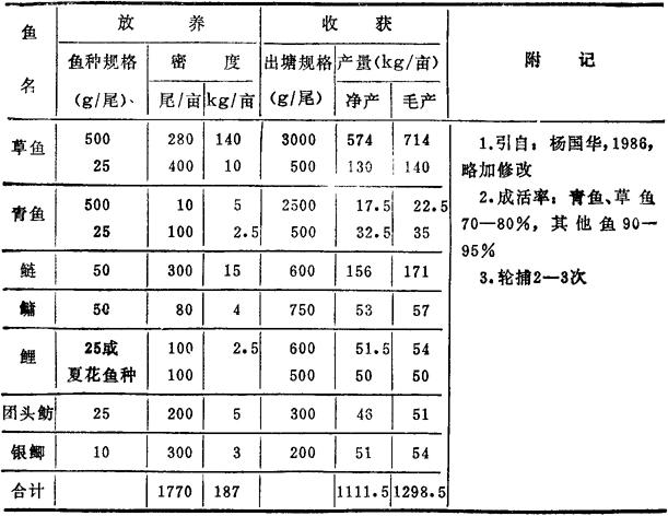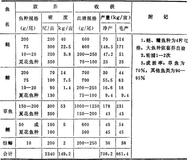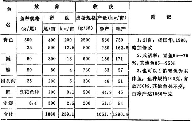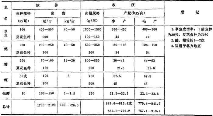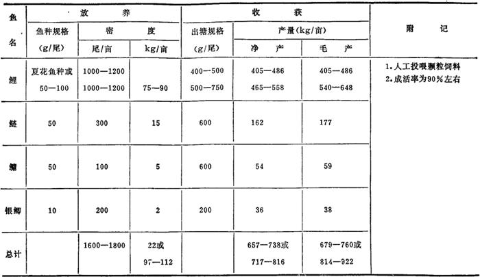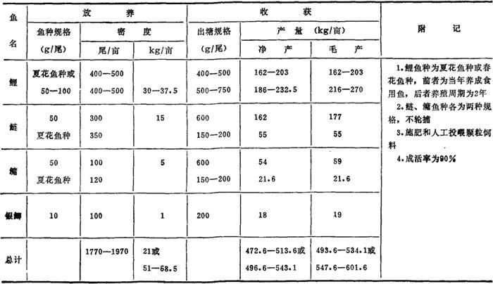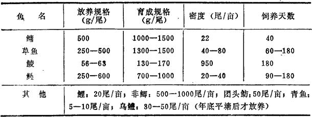 释义 | 静水池塘养殖 一、池塘的基本条件 1.水源和水质 1年四季水源要充足。未被污染的河水、湖水和水库水都是良好的水源,但含有野杂鱼和敌害生物以及悬浮物,引用时应用网过滤(网目不大于每厘米7目)。溪流水和工厂冷却水也是好水源。泉水和井水等地下水,硬度较大,不浑浊,无敌害生物,也可用于养鱼,但水温较低(温泉水除外),溶氧较低,二氧化碳和氮气的含量较高;引用时要经过较长的渠道或先引入贮水池,曝气增氧和提高水温后再流入鱼池,也可采用少加、勤加的办法,避免过大地降低池水温度。受工矿污染的水,常含有毒物质,不能引用。沼泽地、芦苇地的水,通常有机质过多,矿物质很少,呈酸性,溶氧少,是养鱼的劣等水,尽量不采用。 优良水质标准:溶氧充足((4—5mg/L以上)、pH偏碱性(7—8.5)、总硬度为5—8德国度、氮磷比例最好为7—10∶1、化学耗氧量小于30mg/L、非电离氨低于0.1mg/L、硫化氢不允许存在、总盐分小于2‰。 2.土质和底质 土质最好是壤土,其保水保肥力适中,透气性好,饵料生物生长好。砂壤土保水保肥力较壤土差,但透气性好,可以建造池塘。粘土也可以挖鱼池,其保水保肥力强,但透气性差,在培养水质和操作管理上都不如壤土和砂壤土。砂土保水力太差,不适建造池塘。 池塘底部应有10cm左右淤泥(沉积物),以利于保持水质肥度,有利于物质循环和饵料生物生长。但底质淤泥不能过多,因为淤泥吸附性强,会限制营养盐的溶解浓度,而且其中有机物丰富,会分解消耗水中溶解氧,易使水质恶化,酸性增强,病菌易于大量繁殖。 3.面积和深度 养食用鱼的池塘面积以10亩左右为宜,小一些或大一些都可以,但最好不小于5亩和不大于20亩。池塘面积过小,水环境不稳定,不利于物质循环,过大不便于生产操作。 池塘水深以2.5m左右为宜,大池可稍深,小池反之;太浅水体空间小,水质肥度难保持,饵料生物少,鱼产量低;水太深,底层缺氧,不利于上下水层混合,物质循环差,不利于饵料生物和鱼类生长;同时,建造深水池塘成本也较高。 4.形状和周围环境 池塘形状应整齐有规则,最好呈东西向的长方形,以便于操作管理,且接受日照时间较长。池形的长宽比例为2∶1或3∶1。同类池塘的宽度应统一,以利于网具建设和拉网操作。池底要平坦。池塘周围不应有高大树木和房屋,以免遮蔽阳光和风力,影响浮游生物生长和氧气状况。 旧池塘改造应符合上述四项基本条件,以保证池塘标准。 二、放养前的准备 1.修整鱼池 秋后排干塘水,通过冻结、干燥和曝晒以清除病敌害并改良土质;在此期间清除杂草,杂物,挖去过多淤泥,平整池底,修补池边,加固堤埂,疏通注排水渠道,设置拦鱼栅等。 2.药物清塘 最好施用生石灰清塘。清塘方法等见苗种培育部分。 3.注水和施基肥 清塘后7天左右,待药物毒性消失,可注新水70—80cm,施基肥培养浮游生物等饵料生物。鱼种入池后,随水温升高和鱼体长大,逐步加水,至7月份加到最大深度。秋季放养的池塘,池水应一次加到最大深度。 三、鱼种放养 1.鱼种规格 池塘养食用鱼的鱼种,其适宜规格指标应是在一个生长季节或在规定的饲养期内能够达到食用鱼规格。我国各地区各种鱼的食用规格(商品规格)大体上有一个传统指标,即鲢0.5kg以上,鳙0.5kg以上或1.25kg(广东)以上,草鱼1—1.5kg,青鱼2.5kg左右,鲤0.4—0.5kg,团头鲂0.25kg,鲫和鲮0.15kg以上。 鱼种的放养规格应根据各地区气候特点和鱼类生长期长短、鱼类生长规律、食用鱼的计划规格、放养密度和计划产量、单季饲养还是轮养、养鱼周期长短以及是否套养大鱼种等多因素综合考虑,其具体指标可参考表26—1。 表26—1 鱼种规格(g/尾) 2.鱼种搭配 混养是提高静水池塘鱼产量的重要措施。在同一池塘中放养摄食方式、食物组成和栖息水层不同的鱼类,以充分利用池塘水体空间和天然饵料以及人工饲料。在确定搭配种类时应尽量避免或减少在食性和栖息水层上的种间矛盾。鱼种搭配的主要内容包括鲤、草鱼、青鱼、鲮、银鲫等吞食性鱼类与鲢、鳙、白鲫等滤食性鱼类的比例,以及鲢与鳙、鲢鳙与白鲫、草鱼与鲤、青鱼与鲤等习性相似的鱼类之间的比例。鱼种搭配的具体指标可参考表26—2。 表26—2 鱼类混养比例 3。放养密度 放养密度通常包含鱼种的总放养量和每种鱼的放养量两层意思。在同样的养殖条件和措施下,鱼种的放养密度不同会影响到出塘规格和鱼产量。在一定密度范围内出塘规格随密度增大而减少,鱼产量则随密度增大而增加。但当密度过大时,不仅出塘规格急剧下降,而且单位面积鱼产量也会下降。放养密度与计划鱼产量、鱼种规格和层次、计划养成规格、养殖成活率有关,可采用下列公式计算: x——某种鱼的放养密度(尾/亩); p——计划鱼产量(kg/亩); n——该种鱼占总计划产量的百分数; W——该种鱼的计划养成规格(kg/亩); w——该种鱼的放养鱼种规格(kg/亩); k——该种鱼的养殖成活率(%)。 在各种养殖体制和养殖条件下的具体放养密度见“放养模式”。 4.鱼种质量 鱼种质量的指标包括:规格达到规定标准、大小整齐,体质肥满健壮,鳞片完整,无伤,色泽好,遗传性好。当前遗传性较好的品系有亲本来源于长江流域的鲢、鳙、草鱼、青鱼,黑龙江流域产银鲫和日本产白鲫以及建鲤、丰鲤、荷沅鲤、岳鲤等优良杂交一代。 5.鱼种放养时间 放养鱼种的适宜水温为7—10℃。这时鱼活动能力