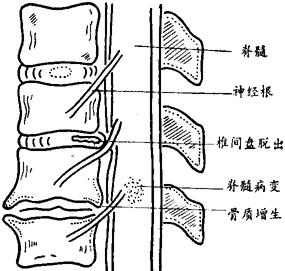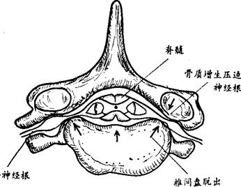 颈椎病(增生性颈椎炎、颈椎骨关节炎、椎间盘脱出、先天性颈椎异常等)可合并神经系症状。一般多认为是由于机械性压迫(增生骨质、黄韧带肥厚、齿状韧带压迫等)与血管循环功能障碍(脊髓血管供血障碍、椎体半脱位所致的椎动脉受压、骨刺形成压迫椎动脉等)所致的神经系病征(图120、121)。