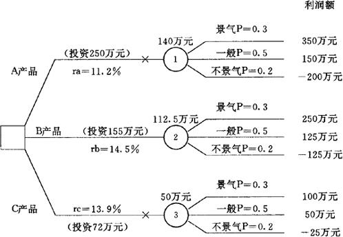 释义 | 风险型决策 风险型决策也叫概率型决策,这类决策的主要特征是:决策的问题存在两种以上的自然状态,且决策者对其无法控制;今后出现哪些自然状态,决策者不能肯定,但其出现的概率,决策者可依据历史统计资料和经验推断,大致地估算出来。但这种概率估计往往还有一定的主观因素,因而这类决策存在一定的风险性。风险型决策主要应用于远期目标的战略决策,或随机因素较多的非常规型决策,诸如企业投资决策、新产品开发决策、技术改造决策和市场营销决策等等。那么,对这类问题依据哪些准则或方法进行决策呢? 1.最大期望收益值准则 期望值,是指某方案的实施期望可获得的损益值。某一方案的期望值等于其在各自然状态下的概率乘以该方案在此状态下损益值的总和。其数学表达式为: 式中:Ti——第i方案的期望值; Tij——第i方案在自然状态Sj下的损益值; Pj(Sj)——自然状态Sj的概率; Sj——为每一方案可能遇到或发生的状态。 决策时,首先要计算出每个方案的期望损益值,然后按一定准则决策选优。“最大期望收益值”准则,是指从收益角度出发,从各方案中选择最大期望收益值的方案为最优方案(Ta)的决策准则。其数学表达式为: Ta=max{T1,T2,……Tm} 2.比较优势准则 比较优势准则,应用于很多方案的初选决策,即从众多方案中选择出几个较有优势的方案的初选决策,而不是选择一个最优方案的最终决策。具体地说,通过诸多方案损益值的对比,确定某些方案为优势方案,则予以保留;某些方案为劣势方案,则舍弃之,从而减少最终决策的备选方案数目。 3.最小期望机会损失值准则 最小期望机会损失值准则就是选择期望机会损失值最小的方案为最优方案的决策准则。 4.决策树技术 风险型决策除了以决策收益表为基础,根据不同情况分别以上述相应的决策原则进行决策外,还可以用决策树进行决策。决策树不仅可以解决决策收益表表达的单阶段决策问题,而且还可以解决收益表难以表达的多阶段的序列决策问题。 (1)决策树的结构 决策树是以方块和圆圈为结点,并由直线把它们连结起来的形似树状的结构,如图2.6-1所示。图2.6-1中,方块结点表示决策事件符号,称决策点;由决策点引出若干条树枝,每条树枝代表一个方案,称之为方案枝;圆圈结点是概率点,由概率点引出若干条树枝,每条树枝表示一种自然状态,称其为概率枝;在概率枝末端列出该自然状态下的损益值。由于决策的问题是多方案的,且每一方案又可能有多种自然状态,因此,图形由左到右,由简到繁构成一个树枝网状结构图。 图2.6-1 决策树结构 (2)决策的步骤 第一,绘制决策树图形。决策树是人们对某个决策问题未来发生情况的可能性和可能结果所作预测在图纸上的反映。所以,绘制决策树的过程,就是拟定各种备选方案的过程,也是对所要决策问题未来可能发生的各种事件步步深入推进的过程。图形绘制由左向右进行。 第二,计算期望值。从右至左,算出各概率点的损益期望值,即将每种自然状态下的收益值乘各自的概率,它们的总和就是该方案的期望值,并将其标在相应概率点上方。 第三,修枝选优。根据不同方案期望值的大小,从右向左逐步后退进行修枝选优。期望值大的为最优方案,期望值小的方案予以舍弃,即在方案枝上画“×”符号,最后在决策结点上只留下一条树枝,它所代表的就是最优方案,并将最优方案的损益期望值标在决策点上方。 (3)单阶段决策实例分析 某企业要在生命周期为五年的A、B、C三种专利产品中选择某一种投入生产,所需投资总额(包括固定资产、流动资金和专利费用)分别为250万元、155万元和72万元。该三种专利产品在市场景气、一般、不景气三种自然状态下的销售概率分别为0.3、0.5和0.2;且据测算若五年内全部回收投资后,A产品在一种自然状态下可获利润350万元、150万元、-200万元,B产品为250万元、125万元、-125万元,C产品为100万元、50万元和-25万元。现企业选择何种专利产品投产,其年均期望投资报酬率最高? 首先,绘制决策树图形,并将有关数据标在图上,以便分析。决策树图如图2.6-2所示: 图2.6-2 其次,从右向左分别计算各方案五年内的期望利润,并标在相应的概率点上。 概率点①:350×0.3+150×0.5+(-200)×0.2=140万元 概率点②:250×0.3+125×0.5+(-125×0.2)=112.5万元 概率点③:100×0.3+50×0.5+(-25×0.2)=50万元 再次,计算各方案的投资年均期望利润率,并修枝选优。 这表明A、B、C三种专利产品投产五年期间,其年均投资报酬率分别为11.2%、14.5%和13.9%,由于rb>rc>ra,所以选择专利产品B投产为最优方案。 (4)多阶段决策 若决策问题较复杂,则要创建阶段决策。应用决策树技术于多阶段决策,较为清晰明了。 |
