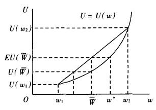 释义 | 风险爱好 又译作风险偏好。消费者对风险的一种态度,具有这种态度的消费者称为风险爱好者(Risk Lover)。一般地,一个人在一个随机事件中如果他的期望值的效用小于他的期望效用或效用期望值时,即: 此人即为风险爱好者(见“预期效用函数”辞条)。风险爱好者的效用函数满足条件(1),说明它是严格凸函数,即其加边海塞矩阵是严格正定的。 考虑一个以 作为一个风险爱好者,消费者将选择Ⅰ,即愿意冒风险,这时: U[aω1+(1-a)ω2]<aU(ω1)+(1-a)U(ω2) 图中是a=1/2时的情形,要想使两种选择无差异,只能使确定收益等于W*(> d2U/dω2>0