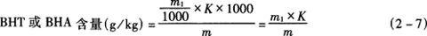 释义 | 食品中BHA与BHT的含量测定 (一)气相色谱法 1.原理 样品中的BHA和BHT用石油醚提取,通过层析柱使BHA与BHT净化,浓缩后,经气相色谱分离后用氢火焰离子化检测器检测,根据样品峰高与标准峰高比较定量。 2.试剂和溶液 2.1 石油醚:沸程30~60℃。 2.2 二氯甲烷。 2.3 二硫化碳。 2.4 无水硫酸钠。 2.5 硅胶 60~80目,于120℃活化4h放干燥器中备用。 2.6 弗罗里硅土 60~80目,于120℃活化4h放干燥器中备用。 2.7 BHA、BHT混合标准贮备液 准确称取BHA、BHT各0.1000g,混合后用二硫化碳溶解,定容至100mL,此溶液分别为每毫升含1.0mgBHA、BHT,置冰箱保存。 2.8 BHA、BHT混合标准使用液 吸取标准储备液4mL于100mL容量瓶中,用二硫化碳定容至100mL,此溶液分别为每毫升含0.040mgBHA、BHT,置冰箱中保存。 3.仪器 3.1 气相色谱仪附FID检测器。 3.2 蒸发器容积200mL。 3.3 振荡器。 3.4 层析柱1×30cm玻璃柱,带活塞。 3.5 气相色谱柱长1.5m,内径3mm玻璃柱,于Gas ChromQ(80~100目)担体上涂10%(m/m)QF-1。 4.样品处理 4.1 试样的制备 采取0.5kg含油脂较多的样品,1kg含油脂少的样品,然后用对角 线取 4.2 脂肪的提取。 4.2.1 含油脂高的样品(如桃酥等):称取50.0g,混合均匀,置于250mL具塞锥形瓶中,加50mL石油醚(沸程为30~60℃),放置过夜,用快速滤纸过滤后,减压回收溶剂,残留脂肪备用。 4.2.2 含油脂中等的样品(如蛋糕、江米条等):称取100g左右,混合均匀,置于500mL具塞锥形瓶中,加100~200mL石油醚(沸程为30~60℃),放置过夜,用快速滤纸过滤后,减压回收溶剂,残留脂肪备用。 4.2.3 含油脂少的样品(如面包、饼干等):称取250~300g,混合均匀后,于500mL具塞锥形瓶中,加入适量石油醚浸泡样品,放置过夜,用快速滤纸过滤后,减压回收溶剂,残留脂肪备用。 5.操作步骤 5.1 试料的制备。 5.1.1 层析柱的制备:于层析柱底部加入少量玻璃棉,少量无水硫酸钠,将硅胶-弗罗里硅土(6+4)共10g,用石油醚湿法混合装柱,柱顶部再加少量无水硫酸钠。 5.1.2 试样制备:称取4.2制备的脂肪0.50~1.00g,用25mL石油醚溶解移入5.1.1的层析柱上,再以100mL二氯甲烷分5次淋洗,合并淋洗液,减压浓缩近干时,用二硫化碳定容至2mL,该溶液为待测溶液。 5.1.3 植物油试料的制备:称取混合均匀样品2.00g,放入50mL烧杯中,加30mL石油醚溶解转移到5.1.1层析柱上,再用10mL石油醚分数次洗涤烧杯,并转移到层析柱,用100mL二氯甲烷分5次淋洗,合并淋洗液,减压浓缩近干,用二硫化碳定容至2mL,该溶液为待测溶液。 5.2 测定 注入气相色谱仪3μL标准使用液,绘制色谱图,分别测量各组分峰高或面积;再注入3μL样品待测溶液(应视样品含量而定),绘制色谱图,分别测量峰高或面积,并与标准峰高或面积比较计算含量。 6.分析结果的表述 式中 m——待测溶液BHA(或BHT)的质量,mg hi——注入色谱样品中BHA(或BHT)的峰高或面积 hs——标准使用液中BHA(或BHT)的峰高或面积 Vi——注入色谱样品溶液的体积或面积 Vm——待测样品定容的体积,mL Vs——注入色谱中标准使用液的体积,mL ρ,——标准使用液的浓度,mg/mL 式中 x1——食品中以脂肪计BHA(或BHT)的含量,g/kg m1——待测溶液中BHA(或BHT)的质量,mg m2——油脂质量(或食品中脂肪的质量),g 结果的表述:报告平行测定算术平均值的2位小数值。 7.允许差 相对相差(BHA、BHT)≤15%。 8.其他 BHA、BHT气相色谱图如图2-1所示。 图2-1 BHA、BHT气相色谱图 气相色谱参考条件: 色谱柱:长1.5m,内径3mm玻璃柱,10%(m/m)QF-1的Gas Chrom Q(80~100目) 检测器:FID 温度:检测室200℃,进样品200℃,柱温140℃ 载气流量:氮气(N2)70mL/min,氢气(H2)50mL/min,空气500mL/min (二)比色法 1.原理 样品经石油醚提取后,通过硅胶柱层析使BHA与BHT分离。BHA与2,6-二氯醌氯亚胺-硼砂溶液生成一种稳定的蓝色化合物。BHT与α,α′-联吡啶-氯化铁溶液生成橘红色物质,可分别进行比色测定。 2.试剂和溶液 2.1 0.01%2,6-二氯醌氯亚胺乙醇溶液 此液用无水乙醇配制,置冰箱保存,供3天使用。 2.2 硼砂缓冲液 称取硼砂3.1g,氯化钾3.5g,加水溶解后,加入1mol/LNaOH溶液32mL,并以水稀释至2000mL。 2.3 0.2%α,α′-联吡啶溶液 称取α,α′-联吡啶0.2g,加入无水乙醇2mL,使之溶解后加水至100mL。 2.4 0.2%三氯化铁溶液 称取三氯化铁0.2g,加水溶解后稀释至100mL。 2.5 30%乙醇溶液。 2.6 72%乙醇溶液。 2.7 无水乙醇。 2.8 30~60℃石油醚。 2.9 60~100目硅胶(不活化)和氧化铝(层析用)。 2.10 BHA标准溶液 准确称取BHA0.050g,加入少许无水乙醇溶解后,移入100mL棕色容量瓶中,并加无水乙醇定容至刻度。此溶液每毫升含BHA0.5mg,注意避光保存,使用时用无水乙醇稀释为每毫升含BHA0.01mg。 2.11 BHT标准溶液 准确称取BHT0.1g,用无水乙醇溶解后,移入100mL棕色容量瓶中,并用无水乙醇稀释至100mL。此溶液每毫升含BHT1mg,注意避光保存。使用时,用无水乙醇稀释为每毫升含BHT0.01mg。 3.仪器 3.1 硅胶柱。 3.2 分光光度计。 4.测定方法 4.1 BHA标准曲线的绘制 准确吸取每毫升含BHA0.01mg的标准溶液0.0、0.2mL、0.4mL、0.6mL、0.8mL、1.0mL或0.0、1.0mL、2.0mL、3.0mL、4.0mL、5.0mL,分别置于25mL比色管中,加入72%乙醇至总体积为8mL,摇匀,加入0.01%2,6-二氯醌氯亚胺溶液1mL,充分混匀后加入硼砂缓冲溶液1mL,再摇匀后静置20min,于分光光度计在620nm波长下测定吸光度,并绘制标准曲线。 4.2 BHT标准曲线的绘制 准确吸取每毫升含BHT0.01mg的标准溶液0.0、0.2mL、0.4mL、0.6mL、0.8mL、1.0mL或0.0、1.0mL、2.0mL、3.0mL、4.0mL、5.0mL,分别置于25mL比色管中,加入0.2%α,α′-联吡啶1mL,摇匀后,在暗