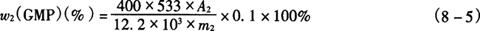 释义 | 食品中呈味核苷酸二钠的测定 化学名:5′-肌苷酸二钠,5′-鸟苷酸二钠5′-肌苷酸二钠(GMP) 结构式: 分子式:C10H11N4Na2O8P·XH2O 相对分子质量(无水):392.17 5′-鸟苷酸二钠 结构式: 分子式:C10H12N5Na2O8P·XH2O 相对分子质量(无水):407.19 一、呈味核苷酸二钠的鉴别 1.试剂和溶液 1.1 异丙醇。 1.2 硫酸铵。 1.3 展开溶液 饱和硫酸铵∶异丙醇∶水=79∶2∶19(体积比)。 1.4 滤纸 新华层析滤纸Ⅲ号。 2.仪器 2.1 紫外分析仪(波长254nm)。 2.2 微量注射器。 2.3 紫外分光光度计,带10mm石英比色皿。 3.操作步骤 3.1 试样液的制备 称取样品1.0g(准确至0.0001g),用水溶解并稀释至100mL,取10.0μL,用新华Ⅲ号滤纸点样,于展开溶液中展开30cm,取出晾干或烘干,在紫外分析仪中划出紫外吸收斑点(IMP与GMP),分别剪于两支Φ10mm×100mm的小试管中,各加0.01mol/LHCl溶液4.0mL;将试管放入80℃恒温水浴,保温30min,冷却,即为含有IMP与GMP的试样液。 3.2 最大吸收波长的测定 分别将试样液倒入1cm光程石英比色杯中,在240~265nm范围内,以0.01mol/LHCl溶液作空白,用紫外分光光度计分别测定其最大吸收波长。 4.结果处理 最大吸收波长在(250±2)nm内,即为IMP;最大吸收波长在(256±2)nm内,即为GMP。 二、IMP和GMP总含量的测定 1.操作步骤 将IMP与GMP的试样液分别倒入1cm光程石英比色杯中,以0.01mol/LHCl溶液作空白,用紫外分光光度计,在250nm、260nm处分别测定IMP与GMP的最大紫外吸光度。 2.分析结果的表述 2.1 IMP含量计算 式中 400——稀释倍数 527——IMP的相对分子质量 11.7×103——IMP的摩尔吸光系数 0.1——样品定容体积,L m1——样品质量,g A1——IMP在波长250nm处的吸光度 2.2 GMP含量计算 式中 400——稀释倍数 533——GMP的相对分子质量 12.2×103——GMP的摩尔吸光系数 0.1——样品定容体积,L m2——样品质量,g A2——GMP在波长260nm处的吸光度 2.3 含量(IMP加GMP)计算 w=w1+w2 (8-6) 式中 w——质量分数(IMP加GMP),% w1——IMP质量分数,% w2——GMP质量分数,% 3.允许差 同一样品两次测定值之差,不得超过1%。 三、食品中呈味核苷酸二钠的测定 见本章第一节和第二节。 |
