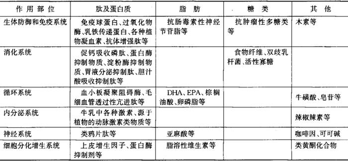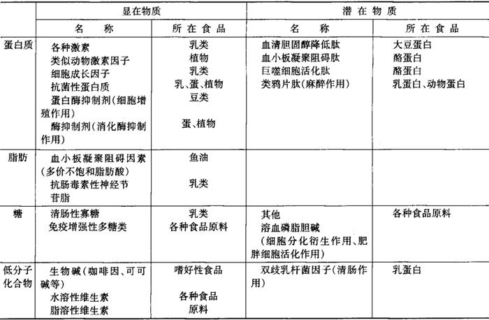 释义 | 食品中的生理功能性物质 源于食品的已知生理功能性因素参见表2-7-2,属于肽、蛋白质、脂肪、糖等的特殊成分与人体防御、免疫、消化、循环、内分泌、神经及细胞分化、生殖等系统有关。 表2-7-2 食品中的生理功能性因子 表2-7-3为食品中显在和潜在的功能性生理活性物质。显在物质中,蛋白质有关物质多为激素、细胞增殖与生长因子、抗菌性蛋白质、酶等。脂肪有关物质为含于鱼油中的血小板凝聚阻害因子二十碳五烯酸(EPA)。糖类物质有乳中的清肠性寡糖和免疫性多糖。低分子物质有生物碱和维生素类。潜在的物质由于在消化过程中被切断,具有显在化活性功能,因此发现较晚,多含于蛋白质衍生的肽类中。 表2-7-3 食品中的生理功能性物质 |