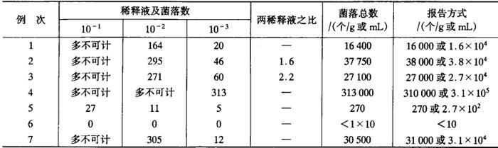 释义 | 食品卫生微生物学检验 菌落总数测定(摘自GB4789.2) (一)主题内容与适用范围 本标准规定了食品中菌落总数的测定方法。 本标准适用于食品中菌落总数的测定。 (二)术语 菌落总数是指食品检样经过处理,在一定条件下培养后(如培基成分、培养温度和时间、pH、需氧性质等)所得1mL(g)检样中所含菌落的总数。本方法规定的培养条件下所得结果,只包括一群在营养琼脂上生长发育的嗜中温性需氧的菌落总数。 菌落总数主要作为判定食品被污染程度的标志,也可以应用这一方法观察细菌在食品中繁殖的动态,以便对被检样品进行卫生学评价时提供依据。 (三)引用标准 GB4789.28 食品卫生微生物学检验染色法、培养基和试剂 (四)设备和材料 (1)温箱 36±1℃。 (2)冰箱 0~4℃。 (3)恒温水浴 46±1℃。 (4)天平。 (5)电炉。 (6)吸管。 (7)广口瓶或三角瓶 容量为500mL。 (8)玻璃珠 直径约5mm。 (9)平皿 直径为90mm。 (10)试管。 (11)放大镜。 (12)菌落计数器。 (13)酒精灯。 (14)均质器或乳钵。 (15)试管架。 (16)灭菌刀或剪子。 (17)灭菌镊子。 (五)培养基和试剂 (1)营养琼脂培养基 按GB4789.28中4.7规定。 (2)磷酸盐缓冲稀释液 按GB4789.28中3.22规定。 (3)生理盐水。 (4)75%乙醇。 (六)检验程序 菌落总数的检验程序如下: (七)操作步骤 1.检样稀释及培养 (1)以无菌操作,将检样25g(或mL)剪碎置于含有225mL灭菌生理盐水或其他稀释液的灭菌玻璃瓶(瓶内预置适当数量的玻璃珠)或灭菌乳钵内,经充分振摇或研磨做成1∶10的均匀稀释液。 固体检样在加入稀释液后,最好置于均质器中以8000~10000r/min的速度处理1min,做成1∶10的均匀稀释液。 (2)用1mL灭菌吸管吸取1∶10稀释液1mL,沿管壁徐徐注入含有9mL灭菌生理盐水或其他稀释液的试管内(注意吸管尖端不要触及管内稀释液),振摇试管,混合均匀,做成1∶100的稀释液。 (3)另取1mL灭菌吸管,按上条操作顺序,做10倍递增稀释液,如此每递增稀释一次,即换用1支1mL灭菌吸管。 (4)根据食品卫生标准要求或对标本污染情况的估计,选择2~3个适宜稀释度,分别在做10倍递增稀释的同时,即以吸取该稀释度的吸管移1mL稀释液于灭菌平皿内,每个稀释度做两个平皿。 (5)稀释液移入平皿后,应及时将凉至46℃营养琼脂培养基(可放置于46±1℃水浴保温)注入平皿约15mL,并转动平皿使混合均匀。同时将营养琼脂培养基倾入加有1mL稀释液的灭菌平皿内作空白对照。 (6)待琼脂凝固后,翻转平板,置于36±1℃温箱内培养48±2h。 2.菌落计数方法 做平板菌落计数时,可用肉眼观察,必要时用放大镜检查,以防遗漏。在记下各平板的菌落数后,求出同稀释度的各平板平均菌落总数。 3.菌落计数的报告 (1)平板菌落数的选择 选取菌落数在30~300之间的平板作为菌落总数测定标准。一个稀释度使用两个平板,应采用两个平板平均数,其中一个平板有较大片状菌落生长时,则不宜采用,而应以无片状菌落生长的平板作为该稀释度的菌落数,若片状菌落不到平板的一半,而其余一半中菌落分布又很均匀,即可计算半个平板后乘2以代表全皿菌落数。平皿内如有链状菌落生长时(菌落之间无明显界线),若仅有一条链,可视为一个菌落;如果有不同来源的几条链,则应将每条链作为一个菌落计。 (2)稀释度的选择 ①应选择平均菌落数在30~300之间的稀释度,乘以稀释倍数报告之(见表中例1)。 ②若有两个稀释度,其生长的菌落数均在30~300之间,则视两者之比如何来决定。若其比值小于或等于2,应报告其平均数;若大于2,则报告其中较小的数字(见表中例2及3)。 ③若所有稀释度的平均菌落数均大于300,则应按稀释度最高的平均菌落数乘以稀释倍数报告之(见表中例4)。 ④若所有稀释度的平均菌落数均小于30,则应按稀释度最低的平均菌落数乘以稀释倍数报告之(见表中例5)。 ⑤若所有稀释度均无菌落生长,则以小于1乘以最低稀释倍数报告之(见表中例6)。 ⑥若所有稀释度的平均菌落数均不在30~300之间,其中一部分大于300或小于30时,则以最接近30或300的平均菌落数乘以稀释倍数报告之(见表中例7)。 (3)菌落数的报告 菌落数在100以内时,按其实有数报告,大于100时,采用二位有效数字,在二位有效数字后面的数值,以四舍五入方法计算。为了缩短数字后面的零数,也可用10的指数来表示(见表5-3-2中“报告方式”栏)。 表5-3-2 稀释度选择及菌落数报告方式 |