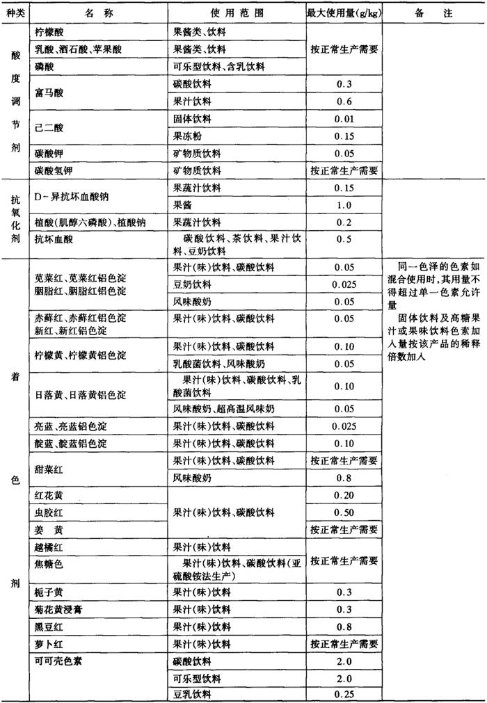 与饮料有关的食品添加剂品种、使用范围和最大使用量见表5-1-9。
