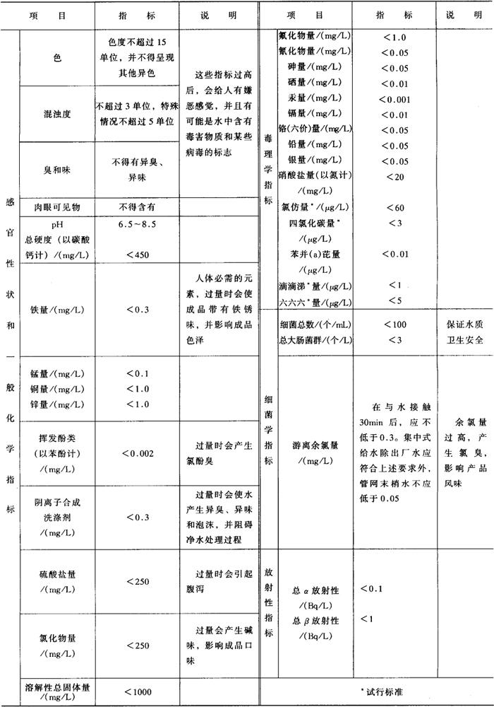 不论是食品生产的原料用水,还是食品生产经营过程中的非工艺用水,都必须符合我国GB 5749-1985《生活饮用水卫生标准》。