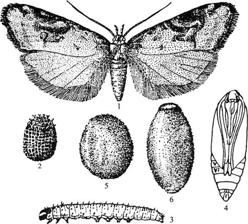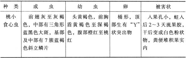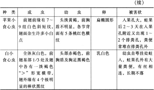 释义 | 食心虫类 蛀食苹果的食心虫有桃小食心虫、苹果小食心虫、白小食心虫3种。从当前对苹果为害程度上看,桃小食心虫最严重。三种食心虫的形态特征和被害状如表1-1: 表1-1 三种食心虫的形态特征和被害症状 1.桃小食心虫 桃小食心虫属鳞翅目蛀果蛾科,简称“桃小”。广泛分布于我国北方,主要为害苹果、枣、桃及梨等果树,是造成这些果树减产、果品质量下降的重要害虫。 【形态特征】: 成虫:灰褐色。前翅灰白色,上面有一个三角形蓝黑色的大斑纹。雄成虫下唇须短而向上翘,触角每节腹面两侧具有纤毛;雌成虫下唇须长而直,向前伸出如剑,触角每节腹面无纤毛。 幼虫:圆筒形,肥胖,橘红色或桃红色。 茧:越冬茧扁圆形,质地紧密,像一层牛皮纸,由幼虫吐丝缀合土粒而成;夏茧纺锤形,长7.8~13毫米,质地疏松,一端有羽化孔。 卵:近圆形,表面密生细的刻纹,顶端生有2~3圈“Y”形刺毛。初产时为淡黄色,以后为橙红色(图1-12)。 图1-12 桃小食心虫 1.成虫 2.卵 3.幼虫 4.蛹 5.冬茧 6.夏茧 成虫:体长14~18毫米,翅展30~38毫米,灰褐色。前翅有褐色肾形斑纹及环状纹,肾形纹前方前缘上具褐纹2条,肾纹外侧具褐色宽横带,端区各脉间生有黑点。后翅淡褐至黄白色,端区黑色或深褐色。 卵:半球形,0.44~0.48毫米,初乳白色后黄白色,孵化前深紫色。 幼虫:体长30~42毫米,体色因食物或环境不同变化很大,由淡绿、淡红至红褐或黑紫色。以绿色型、红褐色型常见。绿色型,体绿色,背线和亚背线深绿色,气门线淡黄色,体表布满褐色或灰色小刺。红褐色型,体红褐或淡红,背线和亚背线淡褐色,气门线白色,毛瘤黑色。腹足趾钩为双序中带,两根前胸侧毛连线与前胸气门下端相切或相交。 蛹:长17~21毫米,黄褐色,腹部第5~7节的背面和腹面有7~8个半圆形刻点,臀棘钩刺2根,尖端微弯。 【发生规律】: 桃小食心虫在不同地区、不同果类上发生世代不相同。黑龙江、吉林和内蒙古南部、宁夏、陕北及甘肃为一年1代;辽宁(辽南、辽西)、山东、河北、山西和陕西关中一带一年1~2代。各地均以老熟幼虫做扁圆形的“冬茧”越冬,越冬的主要场所在苹果园以树干为中心,1米半径范围的表土中和堆果场附近的土壤中。越冬幼虫死亡率为40%~50%。越冬幼虫从5月末至7月中旬陆续出土,出土盛期在6月中下旬。越冬幼虫出土数量与盛发期前10天的降雨量有密切关系,当降雨量达到10毫米以上,6月中下旬即连续大量出土;气候干旱,则出土量少,出土期也稍推迟。 越冬幼虫出土后,多向树干方向爬行,常依傍土、石块或杂草、茎秆等结纺锤形夏茧化蛹。约经15~18天,羽化为成虫。越冬代成虫发生期为6月中旬至7月下旬,盛期在6月末至7月上旬。初期出现的成虫,往往由于气温低不能交配、产卵和繁殖,谓之“无效虫”。成虫白天静伏,夜间活动,以午夜0~2时最盛。产卵前期为2~3天。在适宜温度条件下,每成虫产卵200~300粒。成虫产卵有一定的趋性,越冬代成虫产卵趋向中熟品种,特别是金冠品种为多,而晚熟品种国光很少见卵。第一代成虫产卵,却以国光品种为多。产卵位置绝大部分是在果实上,极少数产在叶、芽、枝上。卵在果实上的分布规律是95%的卵产于萼洼内,5%产在梗洼内,偶尔产在叶背、叶腋或果实粗糙处。卵期约为1周。幼虫孵化后,在果面爬行十几分钟至数小时,然后蛀果,大多从果实胴部蛀入,直达果心,先食果实种子,后潜食果肉,在果实中为害20余天。老熟后咬一个香头大小的圆形脱果孔,钻出落地。7月底以前脱果落地的幼虫都结夏茧化蛹,再变成蛾子继续发生第二代;8月初以后脱果的幼虫结夏茧的数量少,结冬茧的比例逐渐增加;8月底以后脱果的幼虫则全部结冬茧越冬。 内蒙古、新疆一年3代,华北4代,长江流域以南5~7代,以蛹在土中越冬,第二年春季气温达15℃以上时开始羽化。在华北地区4月中下旬开始羽化,5月上中旬进入羽化盛期。第一代卵见于4月下旬至5月底,第一代成虫见于6月初至7月初,6月中旬为盛期,7月份为第二代幼虫为害盛期,7月下旬进入第二代成虫羽化和产卵盛期,第四代卵见于8月下旬至9月上旬,所孵幼虫于10月上中旬老熟入土化蛹越冬。第一代主要于麦类、豌豆、苜蓿等早春作物上为害,第二、第三代为害棉花,第四代为害番茄等蔬菜,从第一代开始为害果树,后期较重。成虫昼伏夜出,对黑光灯趋性强,萎蔫的杨柳树枝条对成虫有诱集作用,卵散产在嫩叶或果实上,每雌可产卵100~200粒,多的可达千余粒。产卵期历时7~13天,卵期3~4天,孵化后先食卵壳,脱皮后先吃皮,低龄幼虫食嫩叶,2龄后蛀果,蛀孔较大,外具虫粪,有转果习性,幼虫期15~22天,共6龄。老熟后入土,于3~9厘米处化蛹。蛹期8~10天。该虫喜温喜湿,成虫产卵适温23℃以上,20℃以下很少产卵。幼虫发育以25~28℃和相对湿度75%~90%最为适宜。北方湿度对其影响更为明显,月降雨量高于100毫米,相对湿度70%以上为害严重。 【防治方法】: 该虫的防治关键是做好预报工作,采取树下防治为主、树上防治为辅,人工与药剂相结合的防治策略。 (1)预测预报工作是适时防治桃小食心虫的关键 ①越冬幼虫出土期预报 在幼虫出土前,选上一年发生严重的苹果树5株(或于秋季采收时取大量虫果堆放在测报树下),将树盘整平耙细,筛上一层细土,在距树干60厘米范围内,均匀放置瓦片15~20片。开始每2~3天检查一次有无出土的幼虫或夏茧,记数后将虫取出,发现有幼虫之日即幼虫开