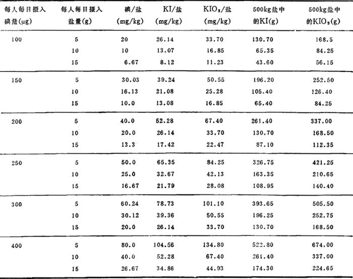 表5-3-4表示了在摄入不同剂量碘时,相应的盐摄入量及所需碘化钾或碘酸钾剂量的相互关系。