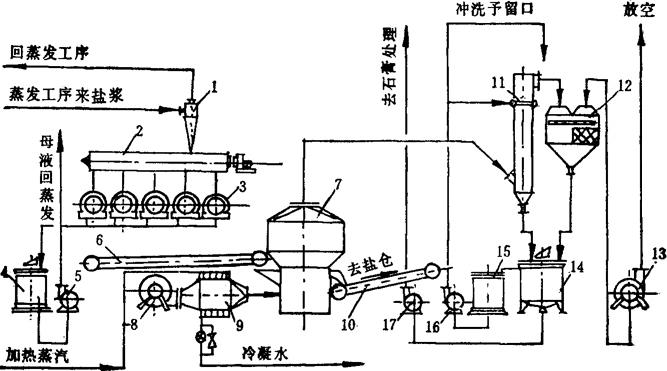 释义 | 食盐的干燥 进入干燥器的食盐、水分越低越好,一般要求含水量不大于3%。 国内中等以上规模盐厂,多采用直接方式干燥,即用热源(蒸汽或烟气)加热空气,热空气直接与湿盐接触传热,使食盐中水分蒸发,达到干燥的目的;也有使用可燃气体(如天然气)燃烧后进入干燥器。用“燃气”直接接触食盐,进行干燥。此外,小盐厂还使用传统的自然干燥和炕锅干燥。 (一)湿空气的I-x图(图3-4-78) 在干燥过程中,湿空气的变化主要反映在热焓量I和湿含量x两个参数上。I-x图是以湿空气中含有1kg干空气为基准,它绘制在两轴间夹角为135°的斜角坐标系上。纵坐标为含有1kg干空气的湿空气的热焓量(kca1),即1kca1/kg干空气;横坐标为含有1kg干空气的湿空气的湿含量(kg),即xkg/kg干空气。湿空气的其他参数如温度t,相对温度Φ和水蒸汽分压力P水蒸汽等也示于同一坐标系上。此图是在大气压力101·32kPa下绘制的,用于湿盐干燥过程的湿空气的总压力都接近于此值,应用此图计算可以满足工程计算上要求的精确度。 Ⅰ-x图上共有5种线 (1)等湿含量线(简称等x线) 湿含量的刻度本应标在与纵轴呈135°倾角的横坐标上,但为了绘制和使用方便,特将湿含量的刻度投影到辅助的水平轴上,就成了辅助x轴。凡垂直于辅助x轴或平行于纵轴的直线都是等湿含量线(x=常数),即是说在线上空气所有状态点的湿含量都相等。 (2)等热焓量线(简称等Ⅰ线) 凡平行于横轴(不是辅助x轴)所引的直线即为等热焓量线(Ⅰ=常数)。每条线上空气所有状态点的热焓量均相等。 (3)等温线(简称等t线)即t=常数的直线。在图上由于设有温度坐标,故不能象等x线、等I线那样很方便地绘出,只能借助于x线与I线来绘。根据热焓量方程I=(0.24+0.46x)t+595x,经整理后变成I=0.24t+(595+0.46t)x。从方程式可看出,当温度t不变时(t=常数),I与x成直线关系。设一个x值,可求出相应的Ⅰ值,如此可得出许多由不同的x与I所构成的交点,连接这些交点的直线就是等温线。作出一条等温线后,然后再假定一个温度,按同样方法可作出第二条等温线。各种不同温度的等温线与辅助x轴成倾斜。其倾斜率为(595+0.46t),故温度越高,其斜率也愈大,因此等温线并不互相平行。 (4)等相对湿度线(简称等Φ线) 此线的作法与等温线的作法类似。 根据湿含量方程: 在该方程中因Φ为已知的常数,例如当Φ=1时,假定一个温度t,查饱和水蒸汽表可得到P′水蒸汽,按上式求出x,由t值和x值可在I-x图上确定一点,该点在Φ=1的相对温度线上,在I-x图上把由不同的t值和x值(当Φ=1时)所确定的点联结起来,则得到Φ=1的相对湿度曲线。其他等Φ线依此类推。 Φ=1的曲线表示在某一定温度下空气完全被水蒸汽所饱和。在此饱和线以上,为不饱和的湿空气区域,在此饱和线以下则为水蒸汽部分地自空气中冷凝析出的区域。 (5)水蒸汽分压线 水蒸汽分压值绘于I-x图之右纵坐标上,其单位为mmHg。水蒸汽分压与湿含量和总压强的关系式如下: 水蒸汽分压线即根据上述方程式绘出。设一个x值,相应求出一个P′水蒸汽。连续假设就可得到许多不同的x值与P′水蒸汽值所构成的交点,连接这些交点得到一条通过坐标原点的曲线,即水蒸汽分压线。 由公式可看出,当总压强P不变时,空气中水蒸汽分压强P′水蒸汽仅取决于x,即对于同一的湿含量x而言,蒸汽的分压为一常数,与空气的温度及相对湿度无关。图中,水蒸汽的分压由等x线与分压曲线的交点求得。 (二)Ⅰ-x图的用法 I-x图上的任何一点,都可以用来确定湿空气的性质,如温度、湿含量、相对湿度、热焓量及蒸汽分压等。 只要知道空气的任意两个参数,在图上把交点找出后,其余参数均可以从图查出。 下面试举几种情况,说明I-x图的用法。 (1)已知干、湿球温度,求空气的湿含量 湿球温度tm(这里可视做绝热饱和温度)的等温线与Φ=1的等Φ线交于A点,沿过A点的等I线上升与干球温度t的等温线交于A′点(由A′至A的过程可视作绝热饱和过程),A点即为已知空气的状态点。过A′点的等x线与辅助x轴相交于x0点,此交点即为空气的湿含量,见图3-4-83。 图3-4-83 I-x图用法之一 (2)已知干球温度、露点,求空气的湿含量及热焓量 取其温度为t露的等温线与Φ=1的等Φ线交于B点(即该空气冷却到露点温度时的状态点),沿B点的等x线垂直向上与干球温度t的等温线交于B′点,则B′点即为所求的空气状态点。过B′点的等x线与辅助x轴的交点即为空气的湿含量;过B′点的等I线与轴的交点即为空气的热焓量(见图3-4-84)。 图3-4-84 I-x图用法之二 (3)已知空气的干球温度和湿含量,求其湿球温度及露点 干球温度为t的等温线和湿含量为x0的等x线的交点C即为空气的状态点。由C点沿等x线与Φ=1的等Φ线相交于C′点,过C′点的等温线所示的温度即为露点t露;过C点的等Ⅰ线与Φ=1的等Φ线交于C″点,过C″点的等温线所示的温度即为该空气的湿球温度tm见图3-4-85。 图3-4-85 I-x图用法之三 (4)已知空气的干球温度和相对湿度,求空气的蒸汽分压和饱和蒸汽分压。过干燥温度为t的等温线和相对湿度为Φ的等Φ线相交于A点,A点即为所求空气的状态点。通过A点的等x线与蒸汽分压线相交,然后再沿此交点作水平线,与右端的纵坐标相交,交点即是空气的蒸汽分压P水蒸汽。通过A点的等温线与Φ=1的等Φ线相交于B点,由交点B沿着等x线与蒸汽分压线相交。然后再沿此交点做水平线与右端纵坐标相交,交点即为空气的饱和蒸汽分