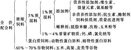 饲料是养鸡业发展的基础。在正常饲养管理条件下,商品代蛋鸡全部生产费用中饲料费用占70%以上,所以科学地配制、生产、使用饲料,可以降低生产成本,以最小的饲料投入,获得最高的蛋产量。添加剂预混料、浓缩料、全价配合料是三种性质完全不同的饲料。图5-2是它们之间关系的示意图。