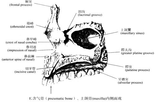 (5)含气骨(pneumatic bone):指骨体有骨腔,内含空气,仅见于少数骨,如上颌骨(maxilla)(图3-3E)、额骨(frontal bone)等。这些含气骨腔对发音有共鸣作用和减轻头的重量作用。