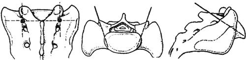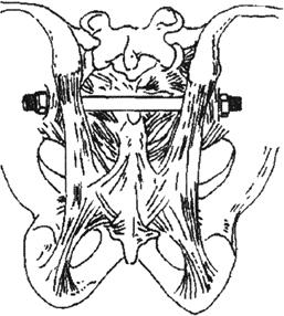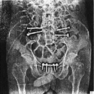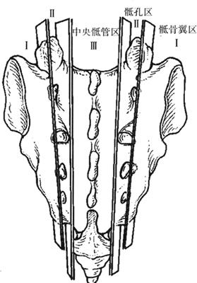 释义 | 骶椎 骶椎骨折和腰骶椎脱位大约占所有脊柱骨折的1%,它们经常与骨盆骨折相伴随,并且经常被忽视。造成这些骨折最常见的原因是机动车事故和坠落伤,对多发伤患者需要高度警惕有骶椎骨折,应该细心检查这些患者是否有神经根功能障碍的表现,如肛周感觉减退和直肠括约肌功能障碍。踝反射减弱和阴茎球海绵体反射消失也提示有骶神经根的损伤。 骶椎骨折分为直接创伤引起的骶椎骨折和间接创伤引起的骶椎骨折两类。直接创伤骶椎骨折最常见的原因是枪弹伤,这种损伤大多数是结构稳定的。直接、严重的钝性创伤可以导致骶椎粉碎性骨折,通常伴有骶神经根损伤。低位的横向骨折是由于尾椎直接受力引起,导致骶尾椎骨折块向前移位。大多数的骶椎骨折都是由于间接损伤引起的,并且90%以上伴有骨盆骨折,这些损伤中有25%~50%合并有神经损伤。 Denis设计了一种分类系统,将骶椎分成3个区:①骶骨翼区;②骶孔区;③中央骶管区(图13-56)。在他报告的236例患者中,神经损伤的发生率为32%,骨折在1区时神经根损伤为5.9%,在2区神经损伤为28%,而在3区神经损伤为87%。骶孔是骶椎中最薄弱的结构。 图13-56 Denis骶骨骨折分区:Ⅰ.骶骨翼区;Ⅱ.骶孔区;Ⅲ.中央骶管区 伴有不稳定性骨盆骨折的骶椎骨折可以通过骨盆外固定架或内固定成功地进行治疗。骶神经根受压、骨折畸形和骨痂引起的迟发性神经损伤并不少见。手术指征为:患者有神经功能障碍,有确切的骨折片或骶椎畸形压迫神经和有慢性疼痛。骶椎椎板切除术可以探查支配下肢远端的下位腰椎和上位骶椎神经根及控制生殖器、膀胱、肛门和直肠功能的下位骶椎神经根。 直肠和膀胱功能恢复的预后是不确定的,其恢复程度决定于神经损伤是因为神经直接受压迫、牵拉损伤还是撕裂损伤引起的。腰骶椎脱位可以通过椎弓根螺丝钉得到有效的固定。骶椎椎板切除、减压和骶神经成分探查的效果是满意的。但是无论通过哪种治疗,直肠和膀胱控制功能的恢复都是不满意的。我们发现骶椎椎板切除在清除血肿、探查神经根、从椎管内去除骨折片和改善或纠正骨畸形等方面是有帮助的。 骶椎骨折的内固定手术技术要求较高,并且依赖于骨的质量和脊柱外科医生的经验。可能出现性功能和直肠及膀胱控制功能障碍这些长期并发症。对于这些少见的但可以引起功能障碍的损伤,治疗应该因人而异。 一、腰骶关节复位内固定术 (一)Galveston内固定术 1977年美国的Allen医生在Luque技术基础上,将2根Luque棒延伸固定到骨盆上,并用钢丝将此两棒固定到棘突两边椎板上,提供牢固的内固定。采用椎板下钢丝固定,应力分散,固定可靠。但内固定本身无矫形功能,且椎板下钢丝操作复杂,危险性大,固定节段长。Galveston适用于腰骶关节脱位及任何需要将腰椎融合固定到骨盆上的病例(图13-57)。器械包括直径5~6mm的长Luque棒2条,0.8~1.2mm各种直径的钢丝。 图13-57 Galveston系统 (1)麻醉、体位:常用全身麻醉或硬脊膜外围滞麻醉。俯卧位,腹部悬空。 (2)入路:做L3~S2的后正中直线切口。切开皮肤、皮下组织,显露腰背筋膜。紧贴棘突两侧切开腰背筋膜及棘突骨膜,行椎板骨膜下剥离,向两侧剥离骶棘肌至小关节外侧缘和横突基底,显露L3~S2棘突椎板。骨膜下剥离臀肌显露髂嵴后部1/3及髂骨外板,直至术者的手指能触及坐骨切迹边缘,清楚解剖出髂后嵴。 (3)髂骨钻孔:在骶棘肌下面,S1~S2棘突间中点相对应的髂骨后嵴上近骶髂关节处打孔。先取一根骨圆针沿坐骨切迹上方1.5cm处插入髂骨内外板之间,钻入6~10cm,注意勿误入骶髂关节间隙,不要穿透髋臼顶。 (4)弯棒:测量几个距离,即钻入口至S1棘突距离(骶段),一般为1.5~2.0cm,插入髂骨内长度(髂段),一般7cm左右(6~10cm,不能少于6cm),L3至S1距离(腰段)。然后取两根长60cm,直径5~6mm的Luque棒,按上述测得的距离弯棒,而且髂段与骶段夹角是45°~65°(在近矢状面上),腰段与骶段夹角为90°(在额状面上),再将腰段棒在矢状面上预弯出与腰前凸相一致的弧度。 (5)椎板下穿钢丝:切除L3~S1之间所有的棘突见韧带、黄韧带,直至显露硬膜外脂肪。做小关节融合术。然后于L3~L5间每一个棘突椎板下,穿过双股直径为1.2mm的钢丝备用。 (6)复位固定:先插好预弯好的金属棒的髂段,再将腰段棒放好,此段下端应与两侧髂后嵴的连线垂直。提拉L5棘突整复脱位,然后先用穿好的钢丝固定金属棒于L5上,再依次拧紧其相邻钢丝,利用弯好金属棒弧度及横向钢丝拉力,矫正脊柱的前凸畸形,重建脊柱的生理弧度。 (7)植骨:于两侧髂骨后部金属棒上方取骨,在L5/S1处多植骨,此处易发生假关节。 (8)术后处理:术后不需石膏外固定,患者能早期下床活动。 (二)椎弓根螺钉内固定术 所有的椎弓根螺钉内固定系统都可用于治疗腰骶关节脱位。椎弓根螺钉系统提拉复位效果好,固定坚固,可进行短节段固定,也可根据病情向上或下随意延长。 椎弓根螺钉手术方法详见上文。S1螺钉的进针点位于S1关节突软骨面中点上方2mm处,方向为尾端倾斜35°~45°,指向S1前角,稍向内侧倾斜(图13-58)。螺钉长度30~40mm。 图13-58 S1椎弓根钉进针点和角度 对于腰骶椎脱位,植骨可采用横突间植骨融合。但最好采用椎体间植骨融合,使用椎体间融合器。椎间植骨的融合率一般可达到90%~95%。 二、骶髂关节复位内固定术 多数骶髂关节脱位宜采用非手术治疗,用伤侧下肢纵向骨牵引整复脱位