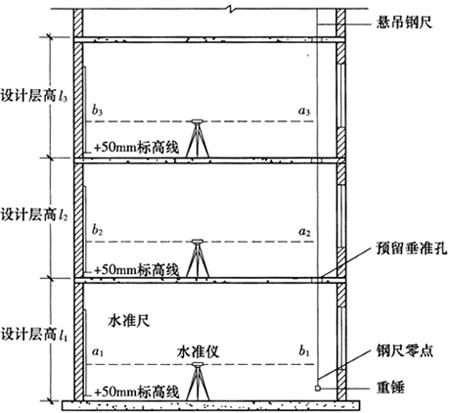 释义 | 高层建筑的高程传递 高层建筑各施工层的标高是由首层±0.00标高线传递上来的,其传递的精度直接影响施工层的标高是否符合设计要求。高层建筑施工的标高偏差,应符合前面已讲述的“竖向精度要求”中的规定。 高层建筑高程传递的方式,主要有钢尺直接测量法、皮数杆传递法和悬吊钢尺传递法等。 (一)钢尺直接测量法 钢尺直接测量法是采用经过校正的标准钢尺,沿着高层建筑结构外墙、边柱或楼梯间,由底层±0.00标高线向上竖直量取设计高差,即可得到施工层的设计标高线。为确保传递高程的准确,在用这种方法传递高程时,应至少由三处底层标高线向上传递,这样便于它们相互校核。 由底层传递到上面同一施工层的几个标高点,必须用水准仪进行校核,检查各标高点是否在同一水平面上,其误差不得超过±3mm。合格后以其平均标高为准,作为该层的地面标高。如果建筑高度超过一个钢尺的尺段(30m或50m),可每隔一个尺段的高度精确测设新的起始标高线,作为继续向上传递高程的依据。 (二)皮数杆传递法 皮数杆传递法是最简单易行的一种方法,尤其在外墙为砌筑工程的高层建筑,采用这种高程传递方法最为适宜。在皮数杆上自±0.00标高线起,门窗口、过梁、楼板等构件的标高已注明。一层楼砌筑完毕后,则从一层皮数杆起逐层往上接。这种方法高程传递的精确度比较差,在施工中应不断地用仪器进行校正。 (三)悬吊钢尺传递法 在外墙或楼梯间悬吊一根标准钢尺,分别在地面和楼面上安置水准仪,将标高传递到楼面上。用于高层建筑传递的钢尺必须经有关部门进行检测,量取高差时尺身应铅直,并且要采用设计规定的拉力,并应进行温度校正。 如图13-13所示,当一层墙体砌筑到1.5m标高后,用水准仪在内墙面上测设一条+50mm的标高线,作为首层地面施工及室内装修的标高依据。以后每砌筑一层,就通过悬吊钢尺从下层的+50mm标高线处向上量出设计层高,再测出上一层+50mm标高线。根据图13-13中的相互位置关系,则第二层为(a2-b2)-(a1-b1)=l1,可解出b2为 图13-13 悬吊钢尺传递法高程示意图 在进行第二层水准测量时,上下移动水准尺,使其读数为b2,沿水准尺底部在墙面上划线,即可得到该层+50mm的标高线。 同理,第三层的b3为 |