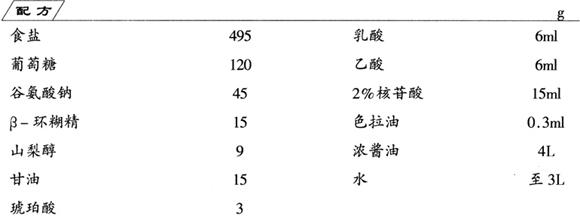 释义 | 高级无色酱油 制法 (1)减压蒸馏 取4L市售浓酱油,在1.99kPa的压力下于40℃进行减压蒸馏,得到1L馏出液,备用。 (2)调味液制备 将上述原料(浓酱油、β-环糊精及色拉油除外)混合,搅拌均匀后备用。 (3)无色酱油制备 将步骤(1)和(2)制得的溶液混合,搅拌均匀后加入β-环糊精和色拉油,并继续搅拌均匀,即成产品。 |
